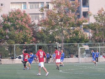 四点钟之前,双方球员便已准备就绪,等待着比赛的开始。环境院球员身着火红的球衣,犹如朵朵浮动的火苗在球场上闪动。他们精神抖擞,信心满满。