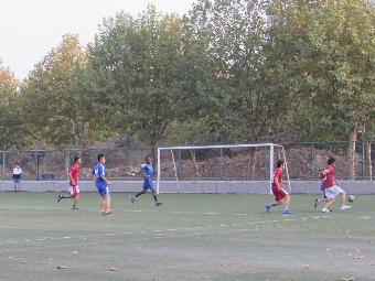 在下午四点钟,裁判的一声令起,双方球员便认真地开始了进攻与防守。上半场中,环境院的队员进行了数次的进攻,有几次攻入对方的防线,不过对方的实力也是很强的,粉碎了进攻了之后,转而攻击环境院的球门。由于策略失当,上半场我院的防守略显狼狈,最后不备被对方攻破两球,而守门员在收球过程中被对方球员犯规踢中,略作休息后,守门员又坚持上场了。他的坚毅也得到了大家的敬佩。