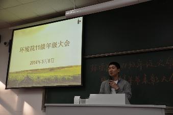 2014年5月8日,环境学院11级举办了一次年级大会暨五四青年节表彰大会,11级全体同学参加了本次会议,出席会议的还有环境学院党委书记陈杰、院党委副书记曹松祥、市政工程系赵联芳老师(给排水一班班导师)、市政工程系许航老师(给排水二班班导师)、市政工程系李超老师(给排水三班班导师),以及11级辅导员周青老师。