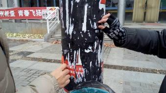 2014年12月11日上午,环境学院14级给排水四班举办了清除校园小广告团日活动,全体同学不畏寒冬,积极参与,成果斐然。