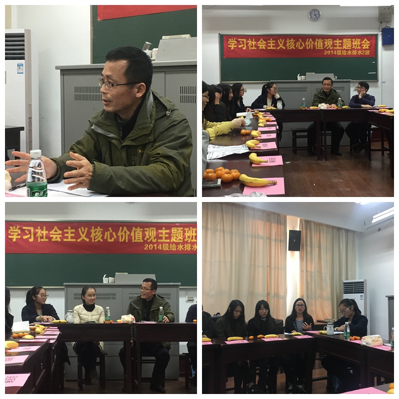 今天是2016年12月1日,在2016年的尾声,14级给排水2班,于工程馆108教室召开了“学习社会主义核心价值观”主题班会暨团日活动。出席本次活动的嘉宾有:环境学院党委书记笪学军老师,14级环境院辅导员曾莉老师。