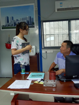 当日上午,全体成员来到南通四建集团公司于河海大学建设项目的现场并受到了河海大学项目总负责人于建光于经理的热情接待。在全体佩戴安全帽后团队成员和于经理就此项目进行了热烈讨论并了解到河海大学项目由于是在先前没有建筑物的基础上进行建造,因此相较于那些将建筑物推掉再建的类型而言,其产生的建筑污染是明显少很多的。小组成员还就建筑废料和噪声问题进行了提问,于 于经理帮组员整理安全帽