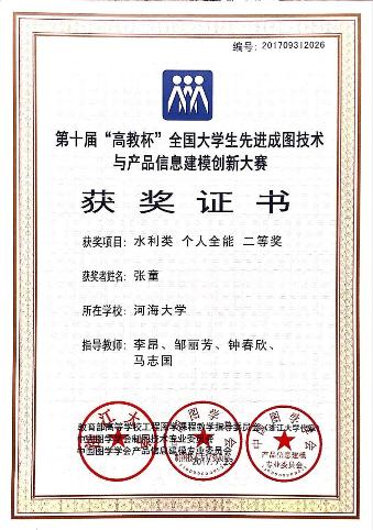 由教育部高等学校工程图学教学指导委员会和中国工程图学学会制图技术专业委员会联合举办的第十届“高教杯”全国大学生先进成图技术、产品信息建模创新大赛于2017年7月21日~24日在兰州交通大学举办。我院2015级给排水科学与工程专业张童同学积极参与,经过选拔和培训,在港航院老师的指导下,荣获水利类尺规绘图一等奖,水利类个人全能二等奖以及水利类团体一等奖的好成绩。