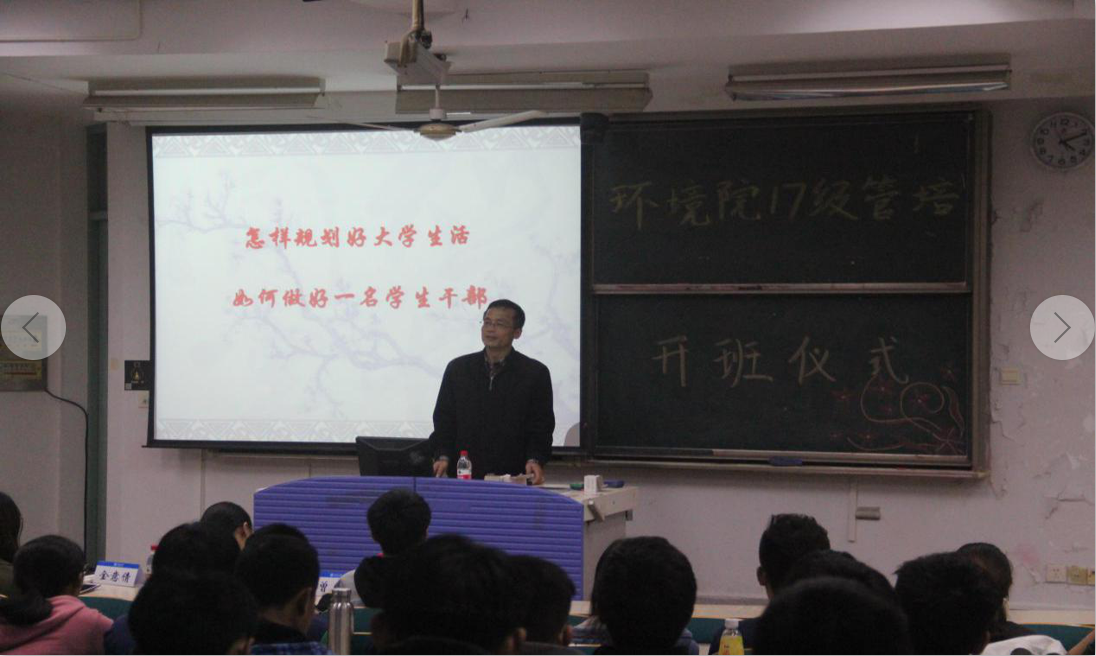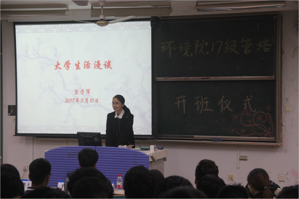 2017年11月10日,河海大学环境学院17级管培开班仪式于高b201教室举行。本活动的主讲人为环境学院党委书记笪学军,主持人为院团委书记兼任14级辅导员老师曾莉,另外16级辅导员老师金意倩,17级辅导员老师钮青也出席本次活动。