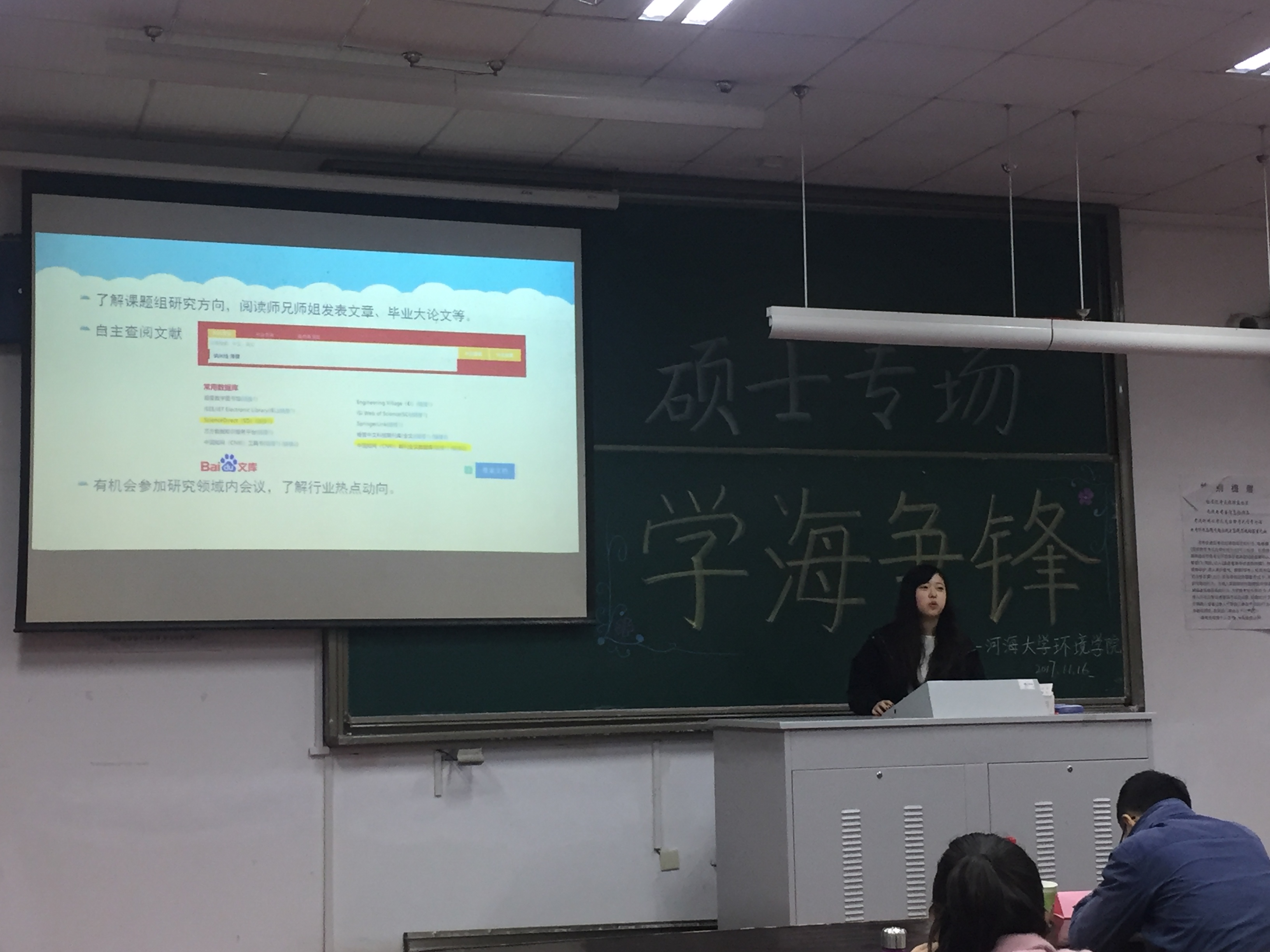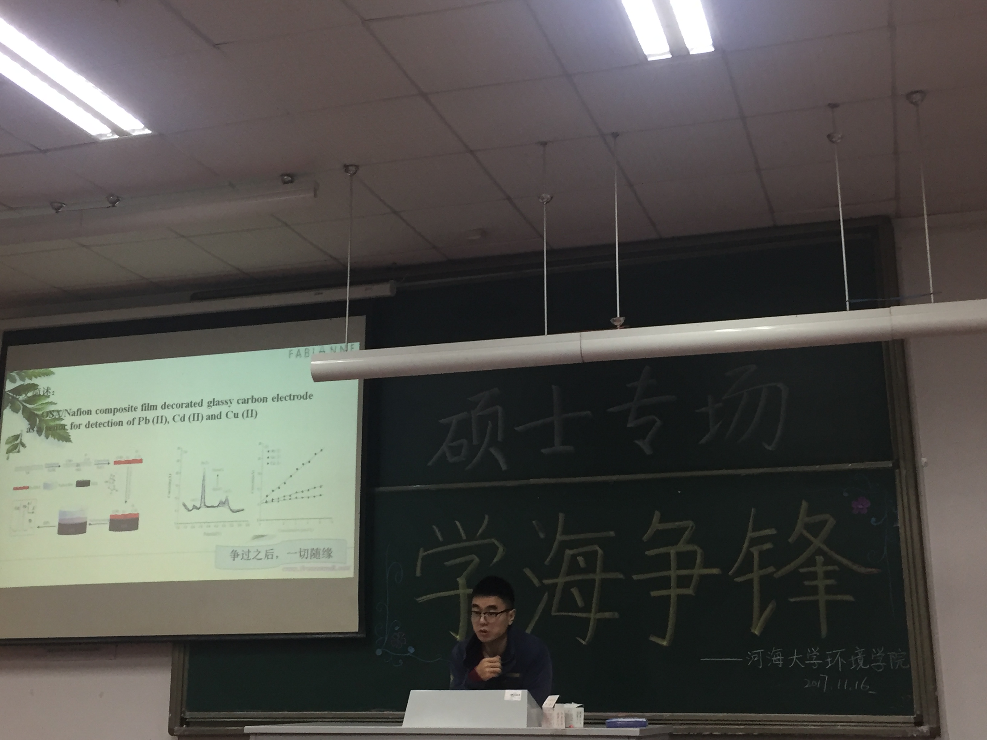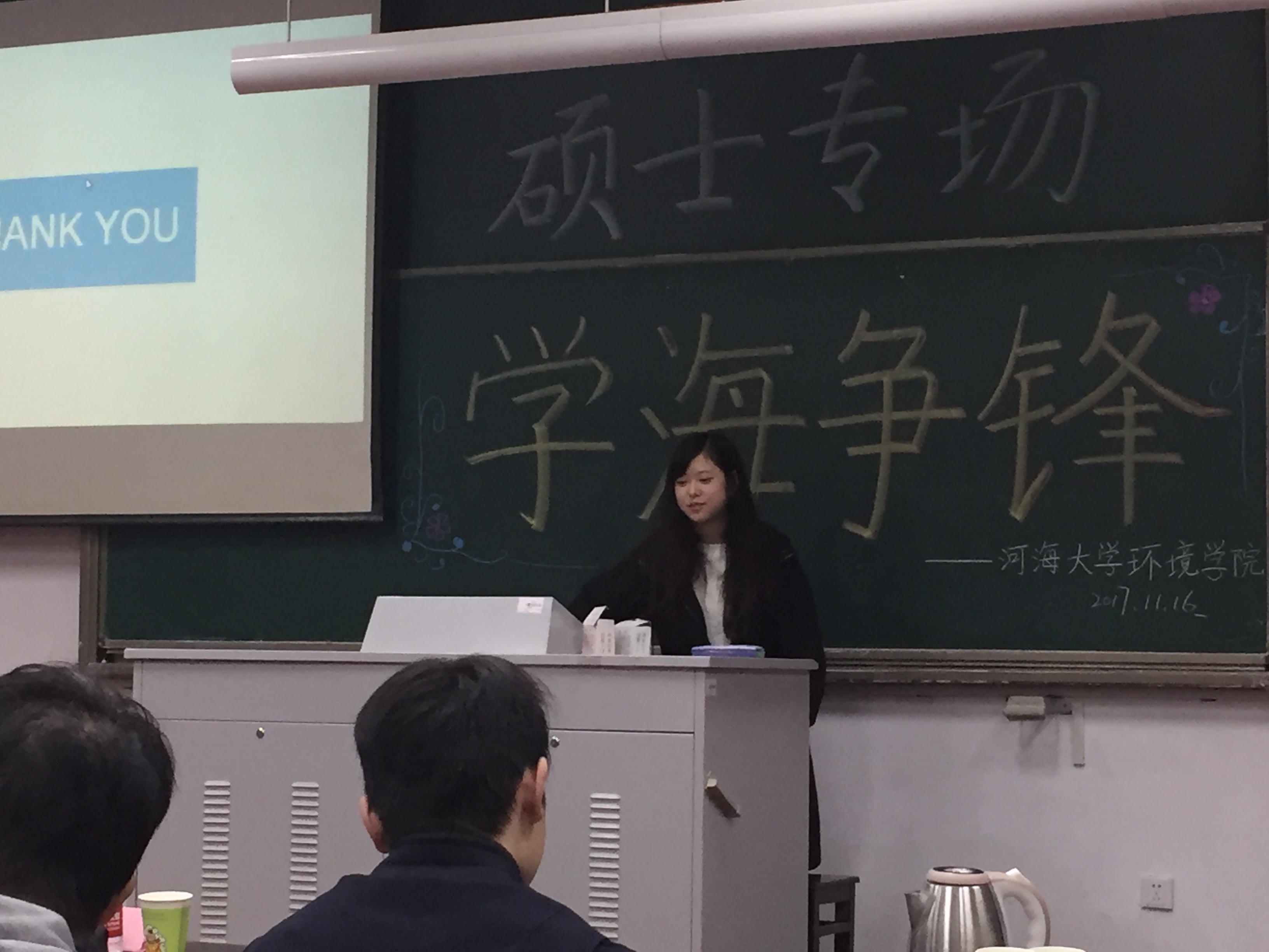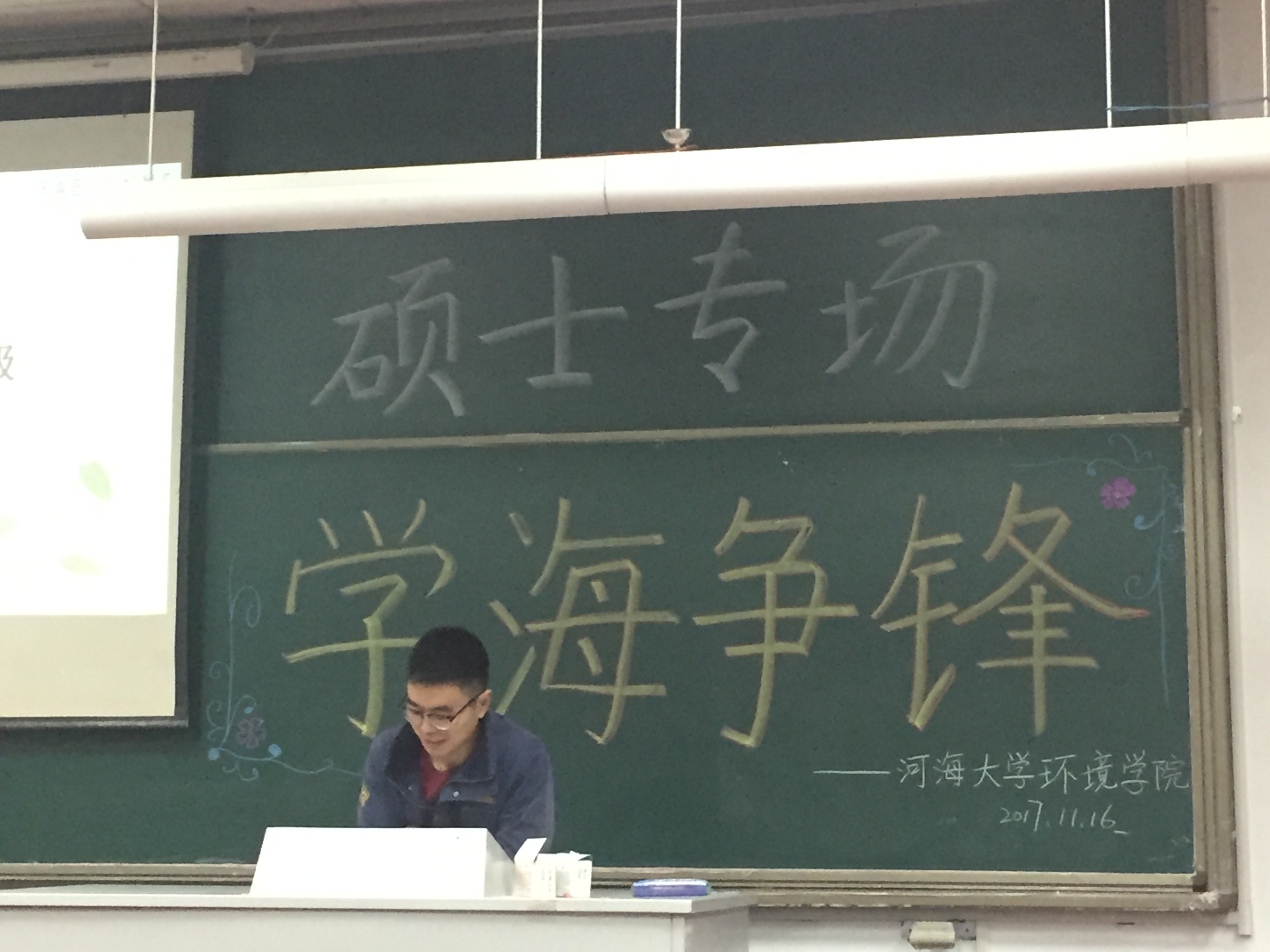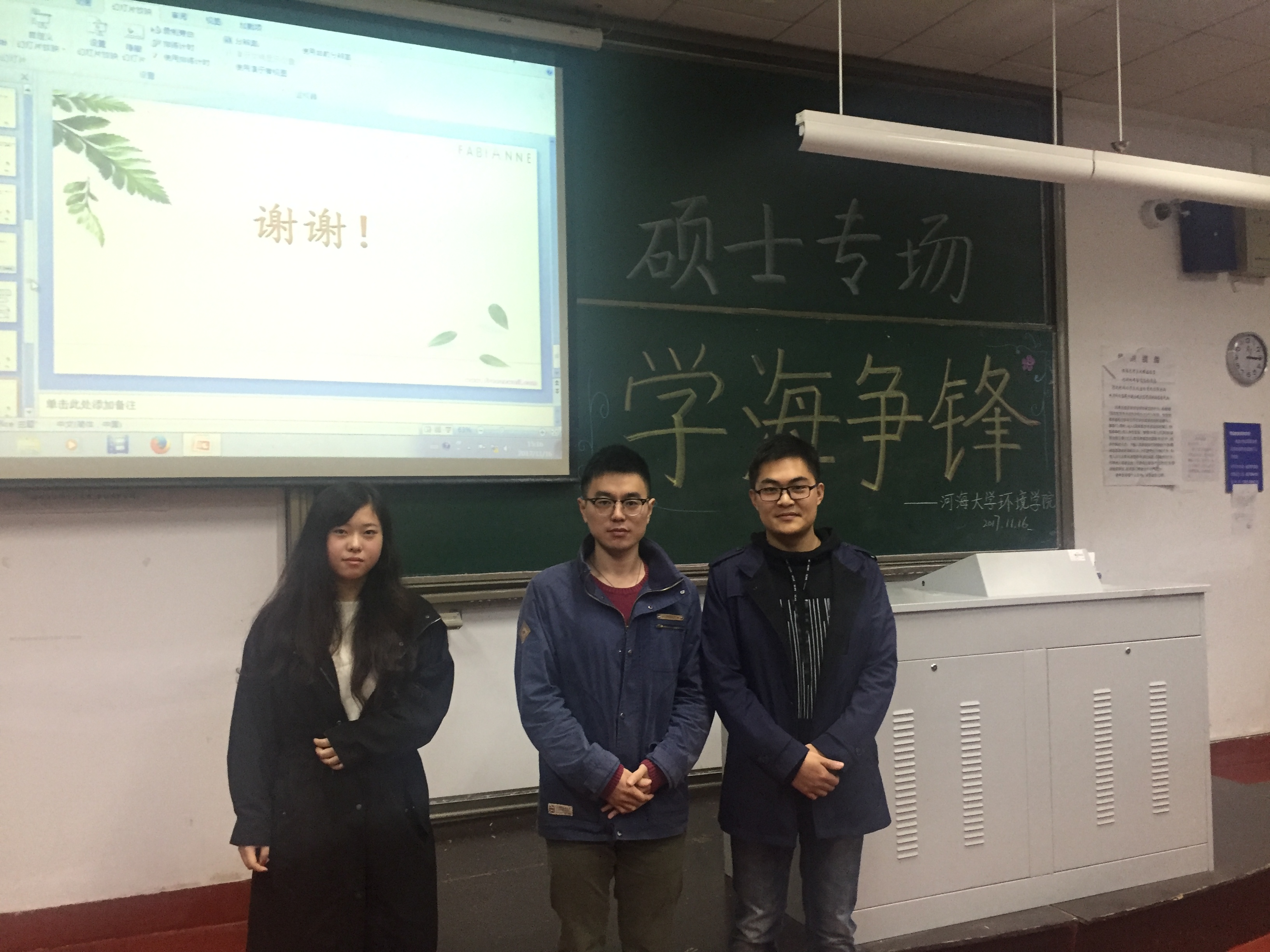 2017年11月16日下午,由环境学院研会研科协策划并举办的“学海争锋——硕士专场”学术讲座于水利馆B101教室举行。本次讲座的三位主讲均是环境学院优秀的研究生,都是今年国家奖学金的获得者,分别是16级市政工程专业的曹臻、15级市政工程的张佳男、15级环境科学与工程的沙海涛。