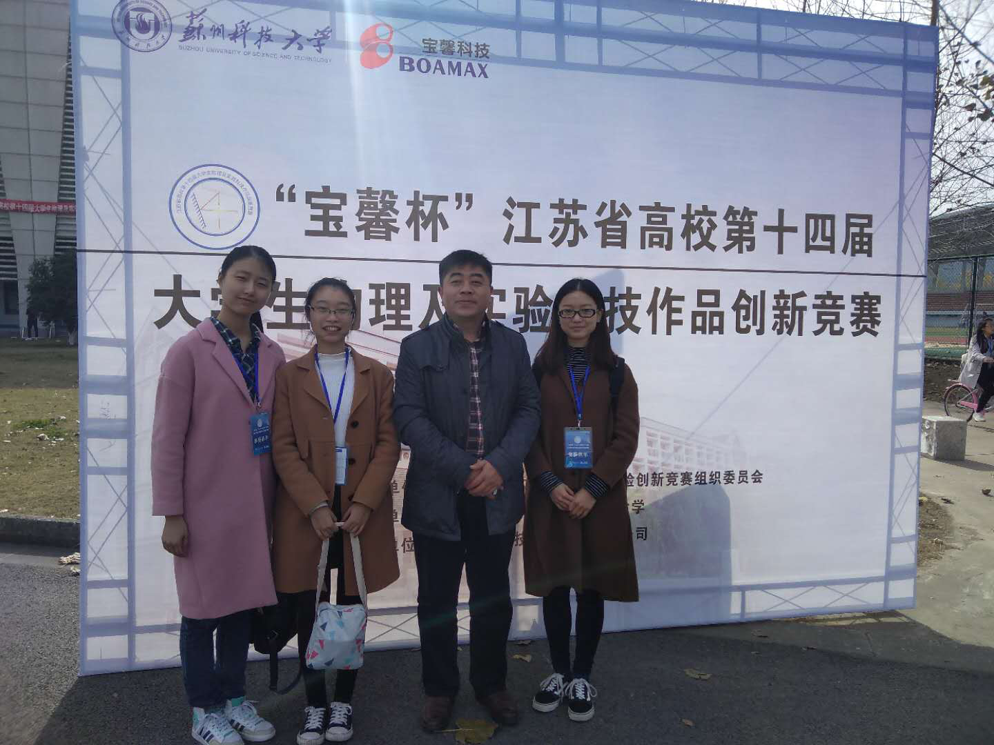 2017年11月25-26日,江苏省高校第十四届大学生物理及实验科技作品创新竞赛在苏州科技大学隆重举行。河海大学环境学院2015级学生高惠子、朱莹、崔贺宁组成的小组在我校周晓峰老师的指导下代表河海大学参加实验科技作品的比赛,经过紧张的备赛,作品《三元催化磁流体清洗复原机》荣获一等奖,《引霾入污空间雾霾疏导净化系统装置》荣获三等奖。