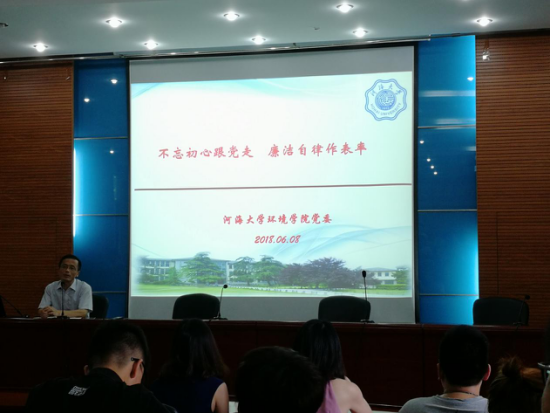 2018年6月8日下午2点30分,河海大学环境学院在校本部水利馆301召开2018届毕业生主题教育——“不忘初心跟党走,廉洁自律作表率”毕业生党员廉洁教育。由党委书记笪学军老师主讲,环境学院2018届毕业生党员参与了此次教育。