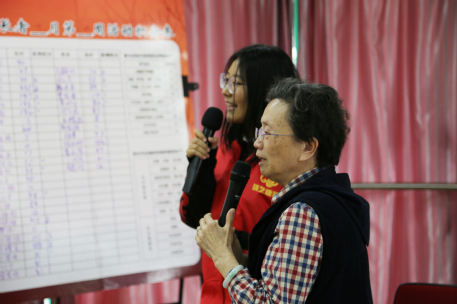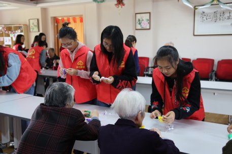 在简单展示了老人们的手工作品后,志愿者组织进行“击鼓传花”游戏,被抽中的同学表演了精心准备的舞蹈,还和老人们一起唱老歌。欣赏着优美的歌声,看到老人们幸福的神色,志愿者们笑得格外甜蜜。