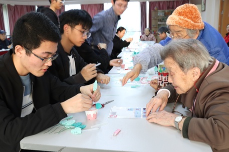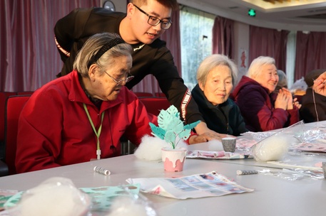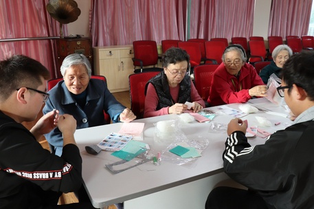 下午2时30分,志愿者们到达了瑞芝康健老年公寓,在简单的任务布置和材料准备后,志愿者们前往老人们的休息室,与爷爷奶奶们一起完成手工作品。
