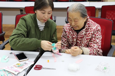 在一同完成手工作品的过程中,也发生了一些小插曲。一位曾在文工团担任文艺工作的的奶奶为志愿者们演唱了一首动听的《蝶恋花》;此外,还有一位饱含学问的爷爷在得知志愿者所学的专业后,与她讨论起了专业的相关知识。在活动中,老人们夸奖志愿者们心灵手巧,与他们建立起了深厚的情谊。