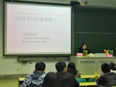 在阐释第一点的时候,黄老师举了现实生活的例子,用讲笑话的方式指出四级的重要性,引来同学们的一阵阵掌声,也激起了同学们对讲座的热情。随后黄老师趁热打铁,从重要性方面解释为什么我们要考四级,并幽默的讲出自己当年的考试经历,引得大家笑声不断。