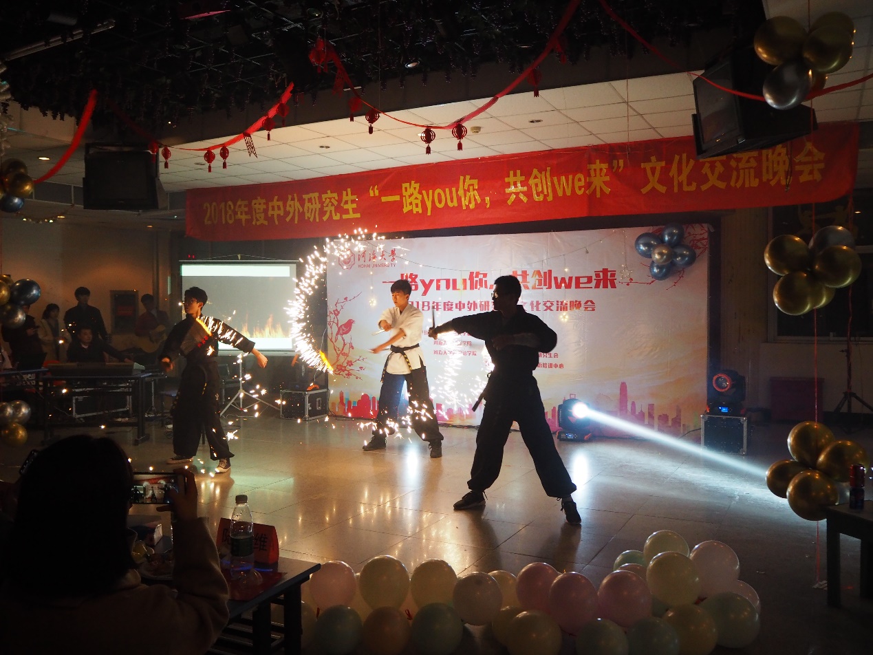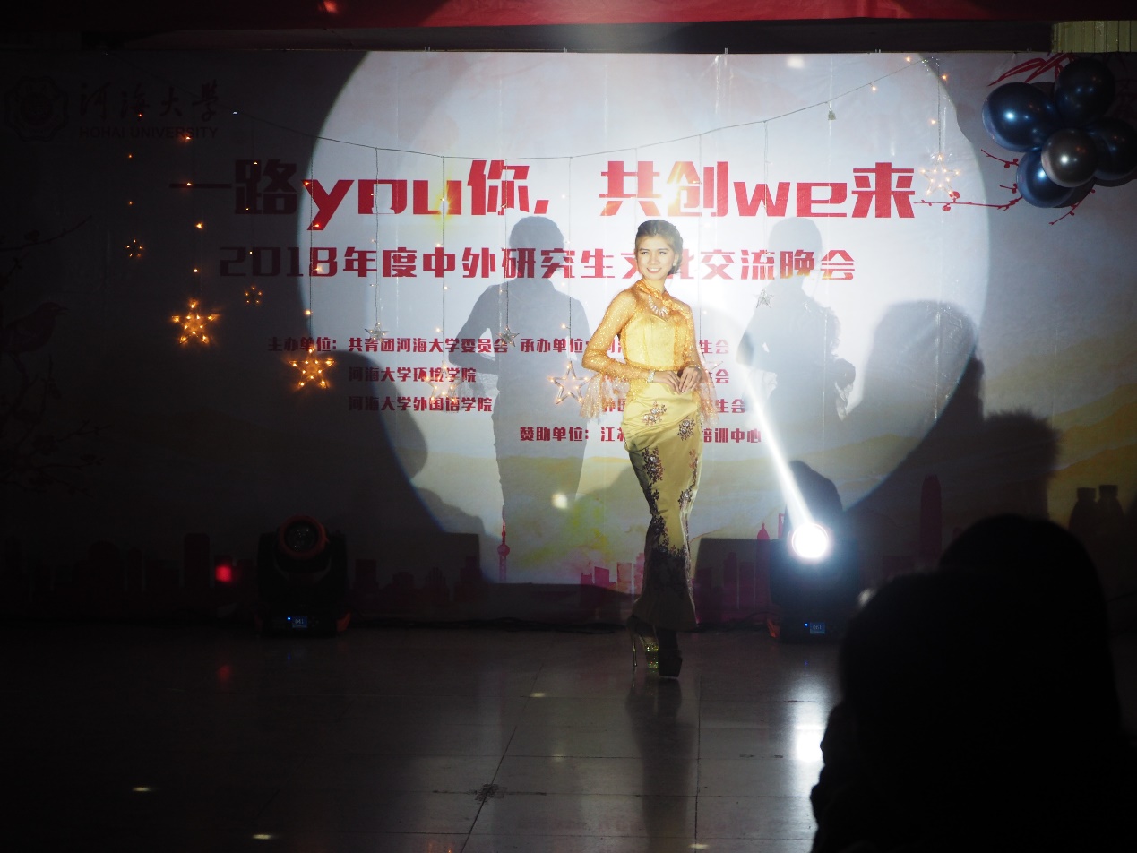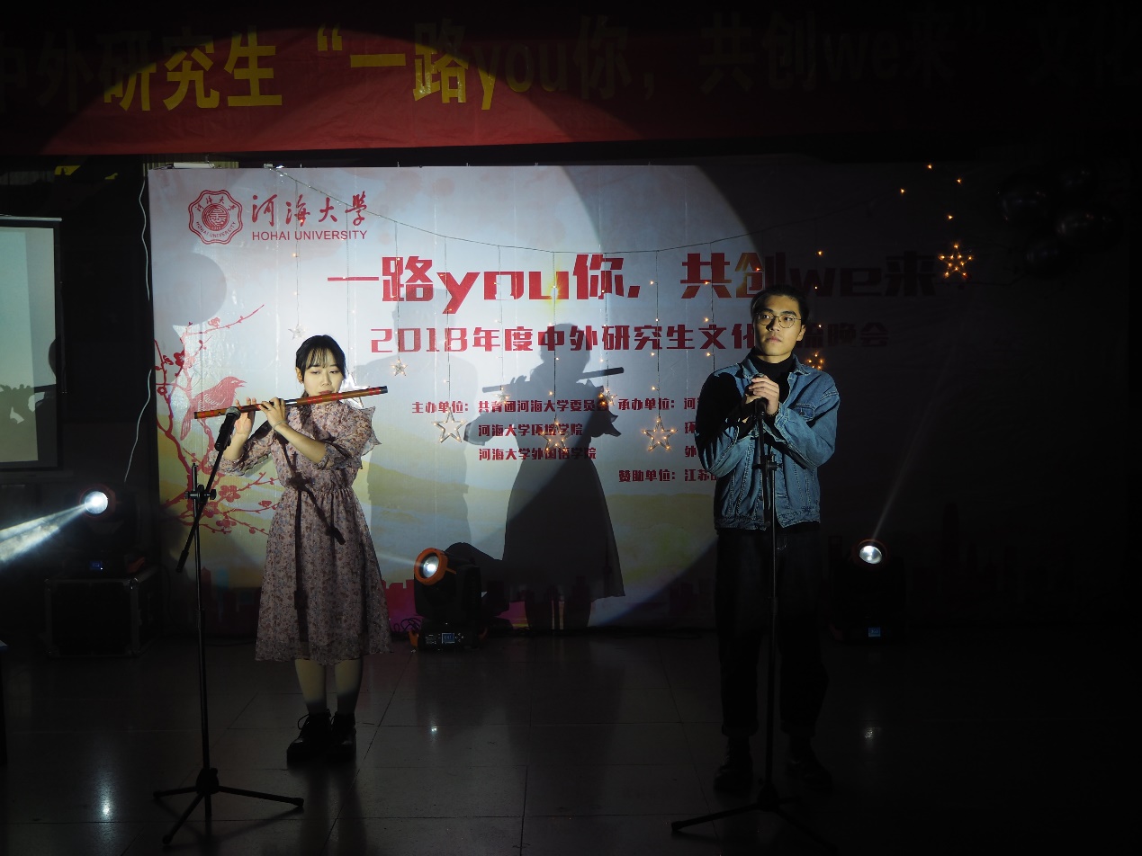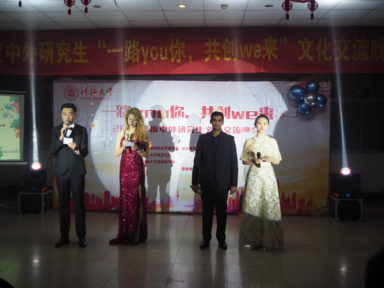 2018年12月8日晚18:30,在河海大学鼓楼校区学生城举办了主题为“一路you你,共创we来”河海大学中外研究生交流晚会。此次晚会由共青团河海大学委员会、河海大学环境学院、河海大学外国语学院主办,河海大学研究生会、环境学院研究生会及外国语学院研究生会承办,旨在丰富同学们课余生活,加强不同国家间的文化交流,推动学校文化活动的蓬勃发展,给各国同学们一个真正展示自我风采和文化交流的舞台。参加晚会的嘉宾有环境学院研究生导员高臣老师和16级环境学院主席团的师兄师姐,以及各学院研究生会主席。