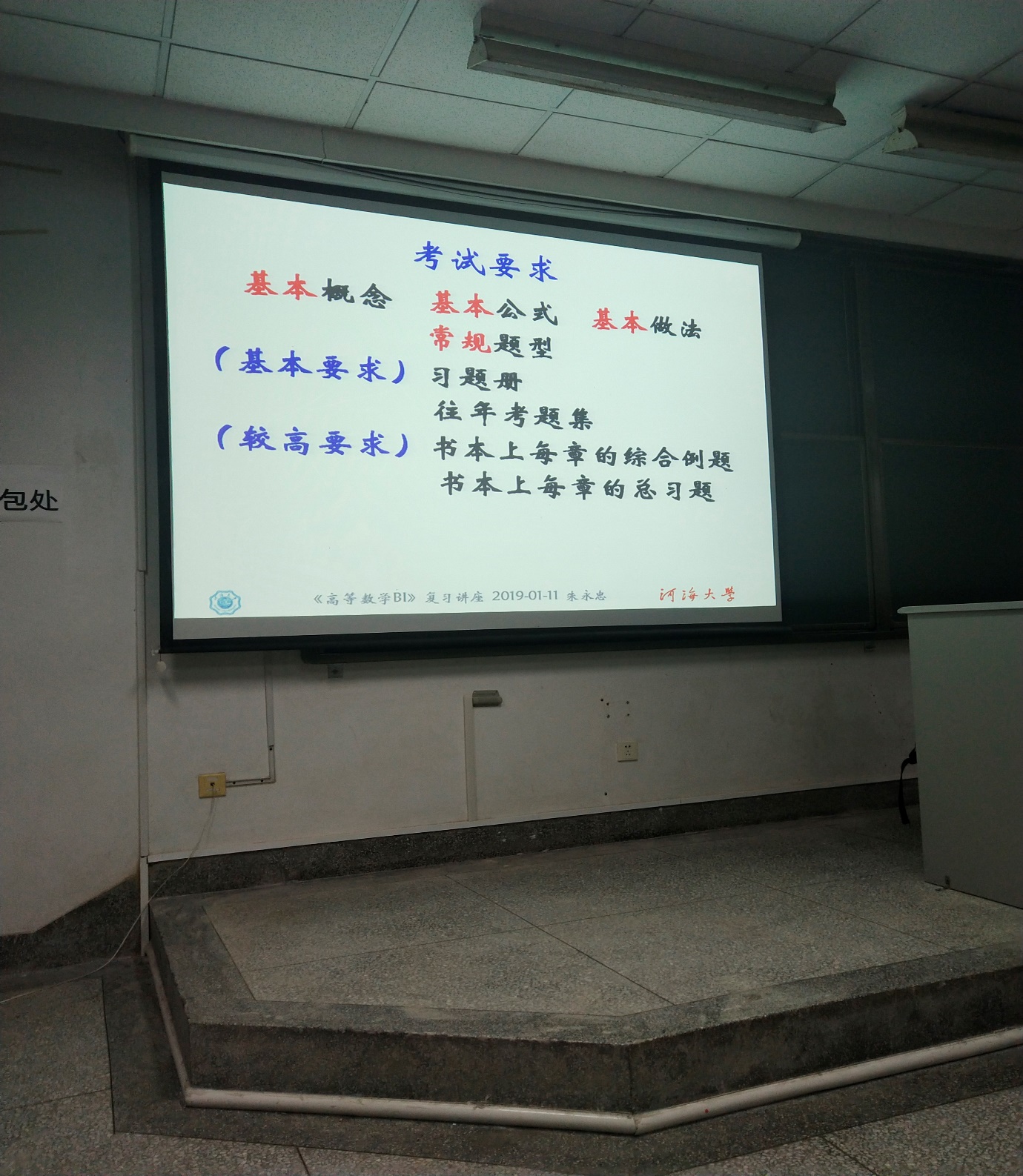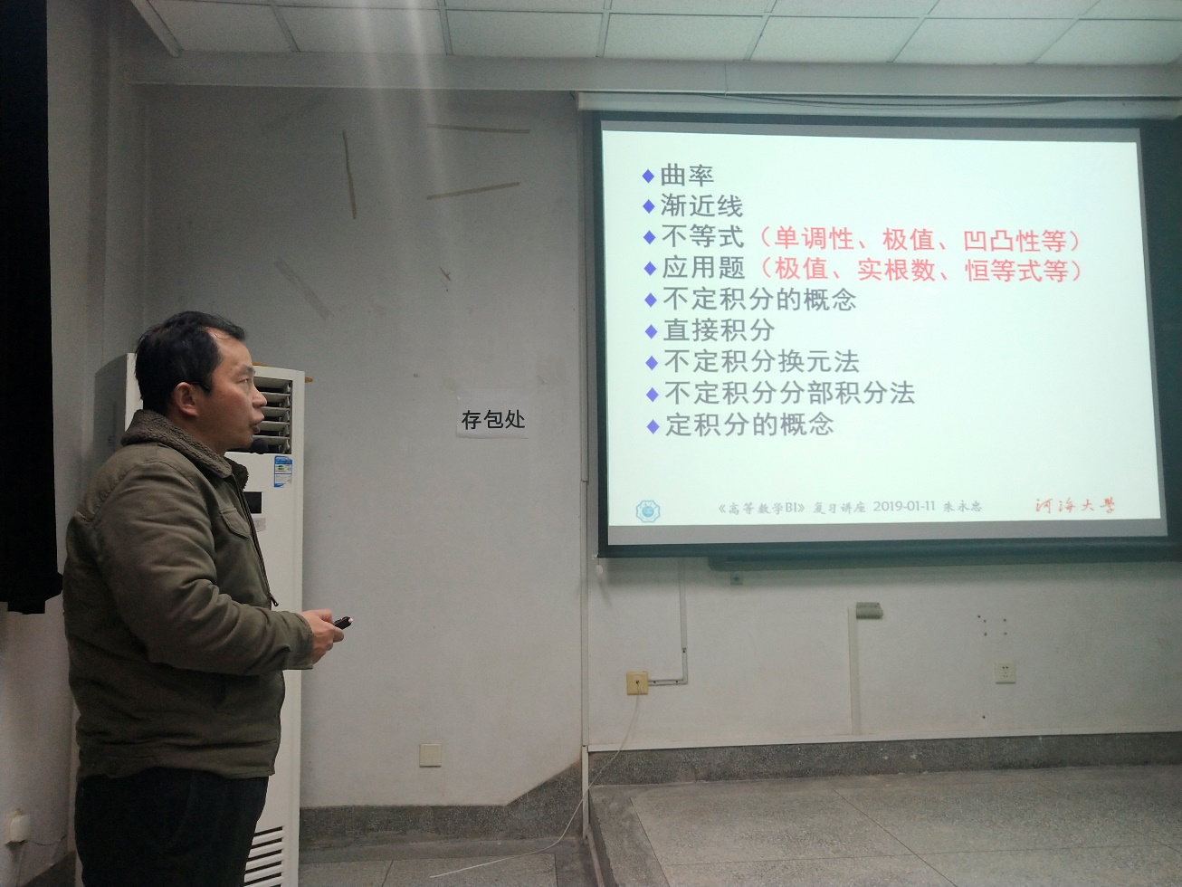 2019年1月12日晚18:30河海大学环境学院学生会学习部于致用楼117教室举办了2018级高数期末讲座。随着高数期末考试的来临,许多大一同学感到了考试的压力,所以学生会学习部特意邀请了教学经验丰富的朱永忠教授作为本次讲座的主讲人。幽默风趣的朱永忠教授在向大家进行了简单的自我介绍之后便进入了今天的主题。