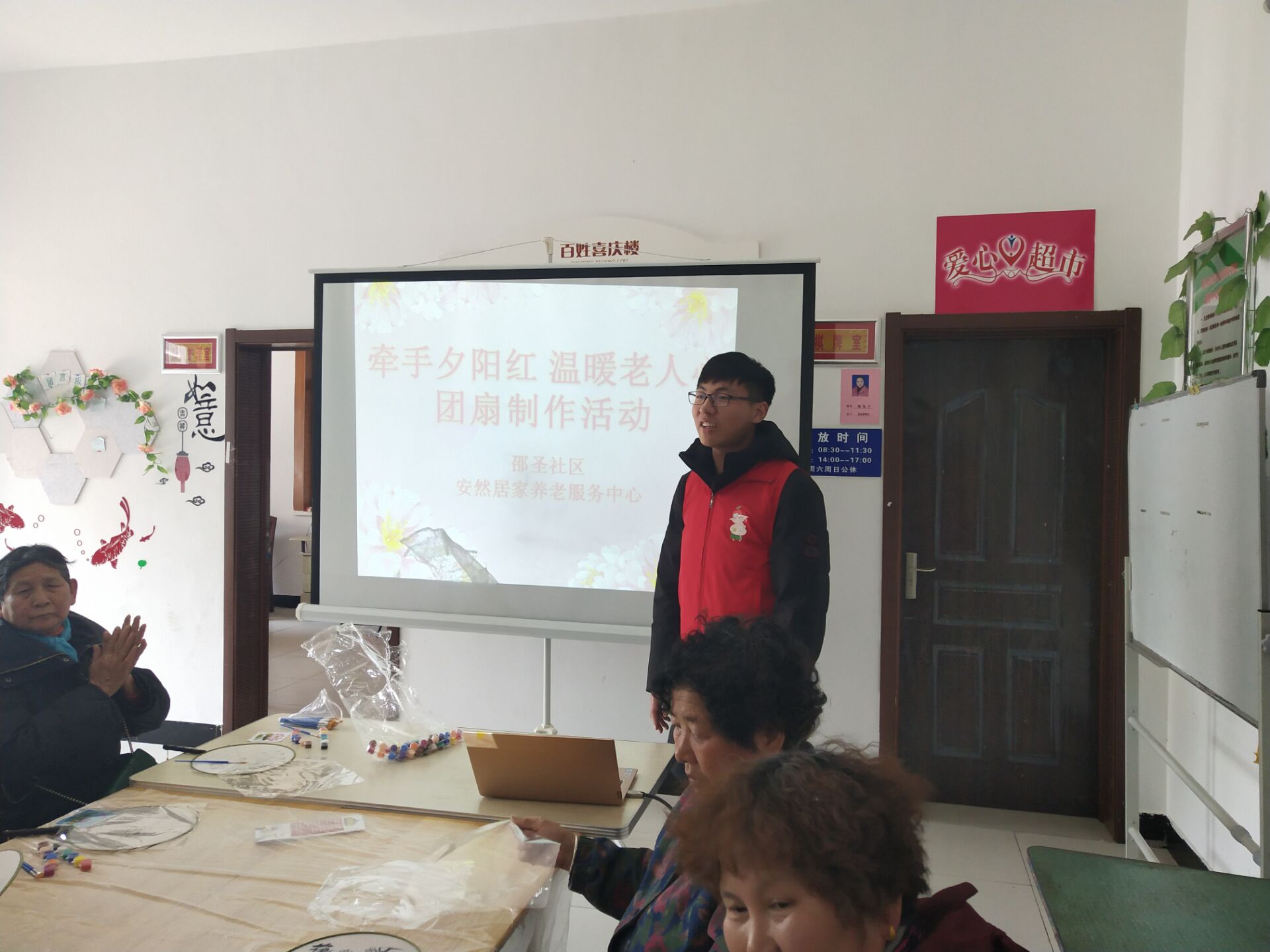 中午12点,志愿者们在东门地铁口集合,随后便乘车来到了东山街道邵圣社区居家养老服务中心。本次活动的主题是制作团扇。在老人到齐之后,志愿者们给老人们每人都分发了团扇及颜料。老人们在拿到了扇面及颜料之后,便开始了团扇的制作。老人们拿着图样,对比着效果图的颜色给扇面上色。志愿者们热心地给老人讲解着上色的方法,或是帮助着老人们在扇面上涂着各式各样的颜料。志愿者们与老人们亲切地交谈着,与老人们开心地互动,让老人们很是开心。很快,老人们的团扇便有原先单调的白色背景变成了五彩斑斓的生动画面。老人们对这次的团扇制作都十分满意。