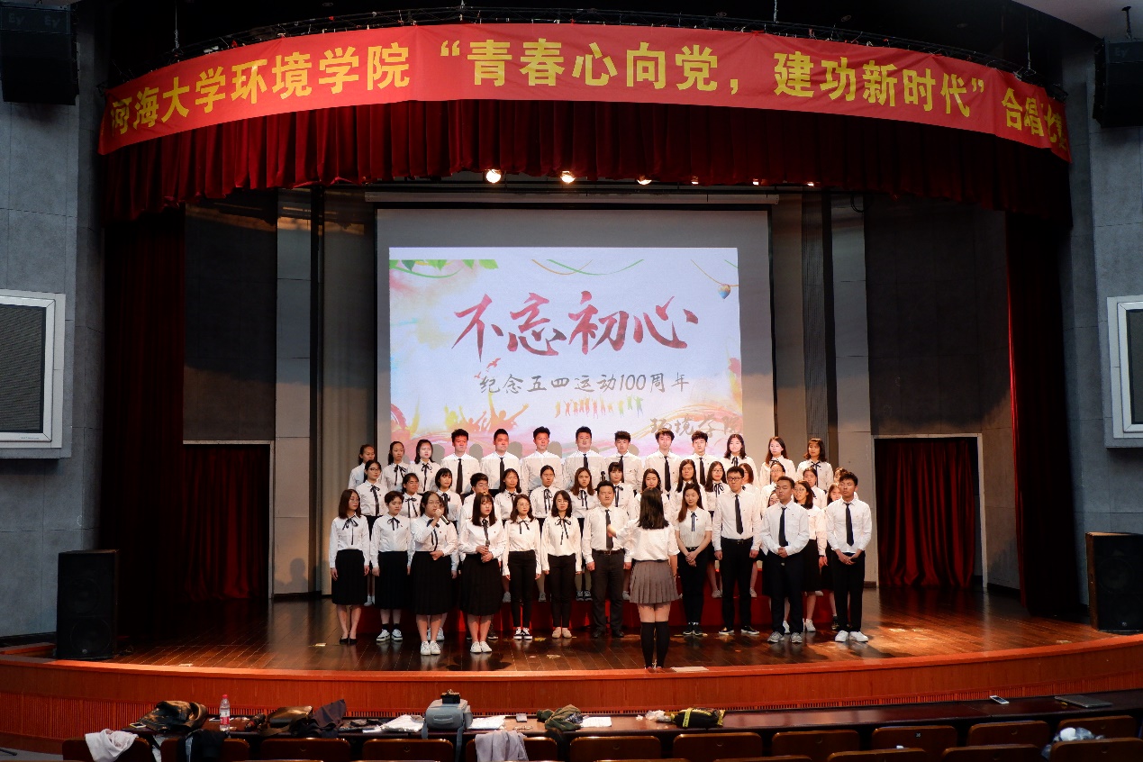2019年4月26日中午,河海大学环境学院在博学楼报告厅举行了以“青春心向党,建功新时代”为主题的合唱活动,来自环境学院各年级各专业的50名同学和院党委副书记曹松祥及全体辅导员老师们一起合唱了一首《不忘初心》,致敬五四青年运动,弘扬五四精神。