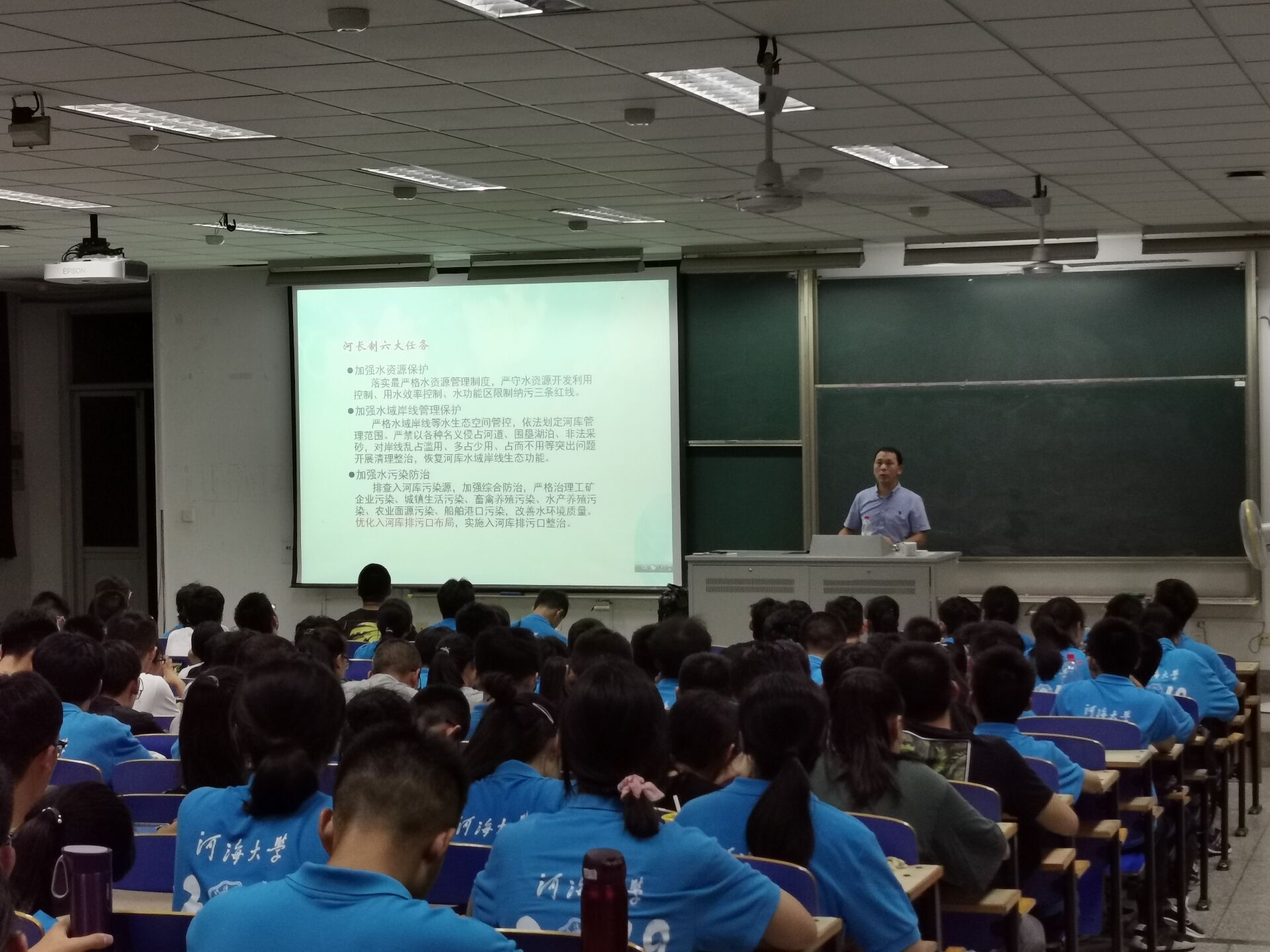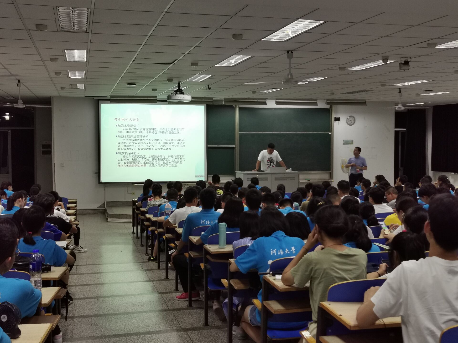 大会一开始,李老师就以喊口号的方式激发同学们的热情。随后李老师在简单的自我介绍后,开始了本次讲座。讲座期间,李老师多次与同学们互动交流,询问同学们对自己专业的认识,现场氛围十分热烈。李老师用各种数据告诉同学们河海大学的优胜之处,还以近期的大型项目河长制为例子,说明在座同学的专业的优越性,增强同学们的自豪感。