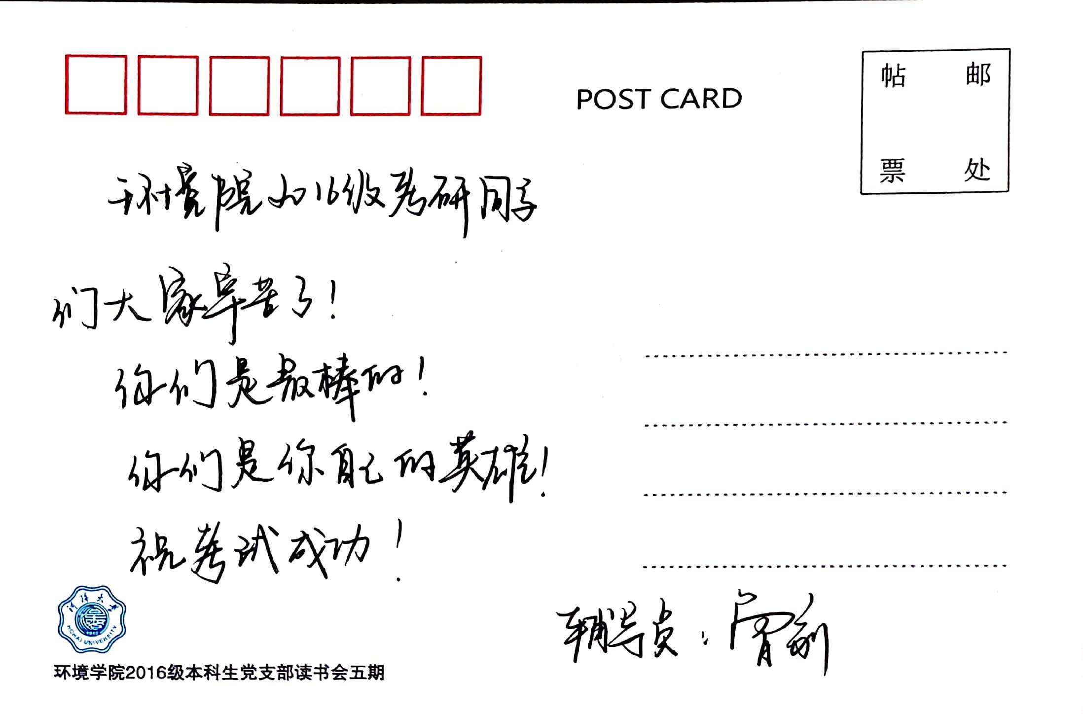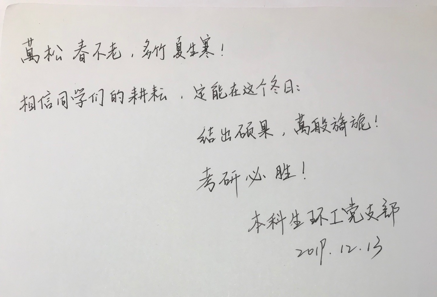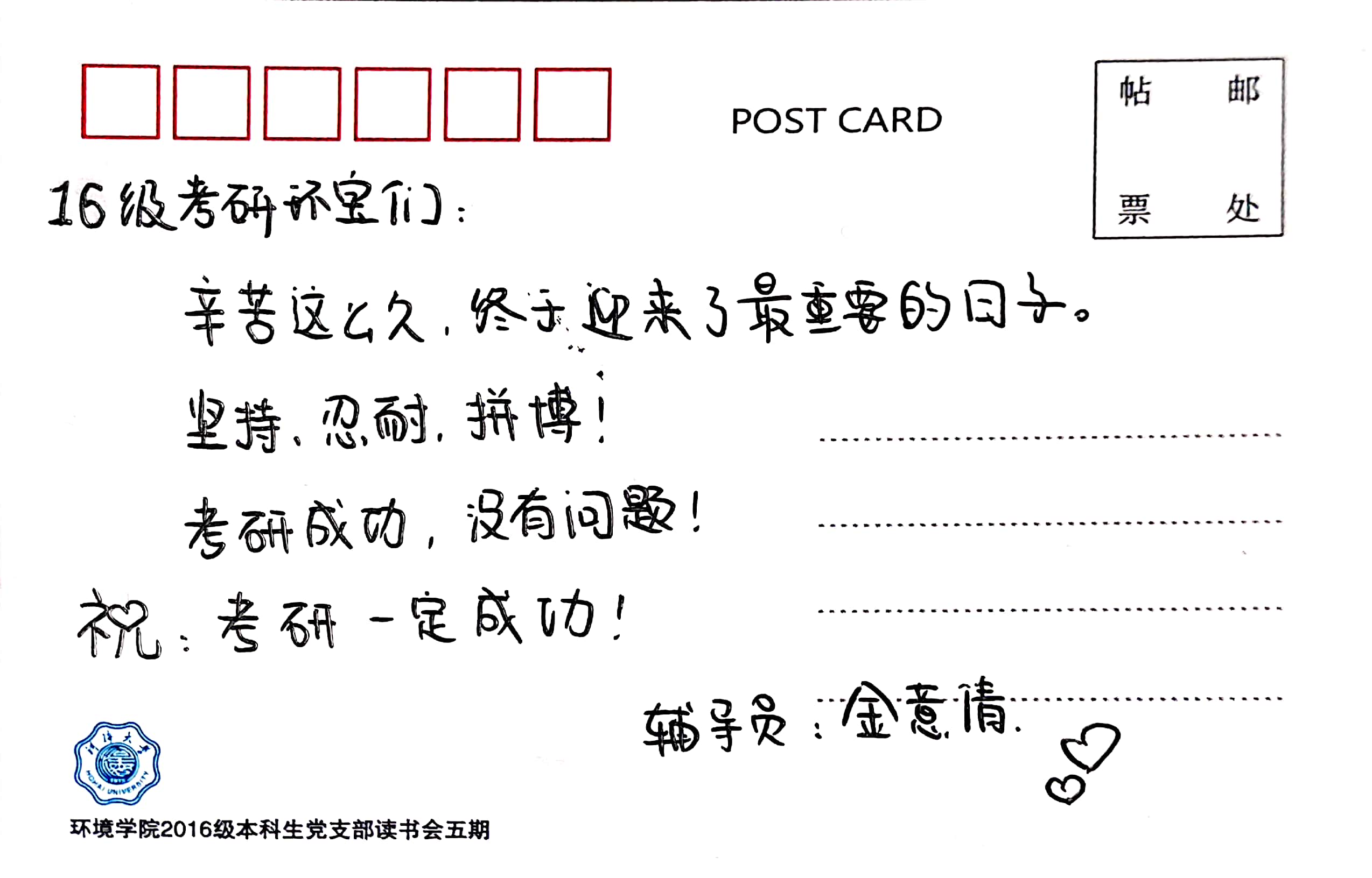 2020考研将至,为帮助环境学院考研学子顺利备考,同时拥有一个积极乐观的备考心态,院党委副书记曹松祥老师、院团委书记兼2016级辅导员曾莉老师、2016级辅导员金意倩都给予同学们鼓励,学院各本科生党支部以及各专业也积极响应发声,写下了诚挚的祝福,给予他们成功的信念与力量。