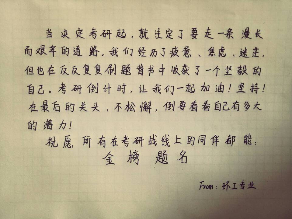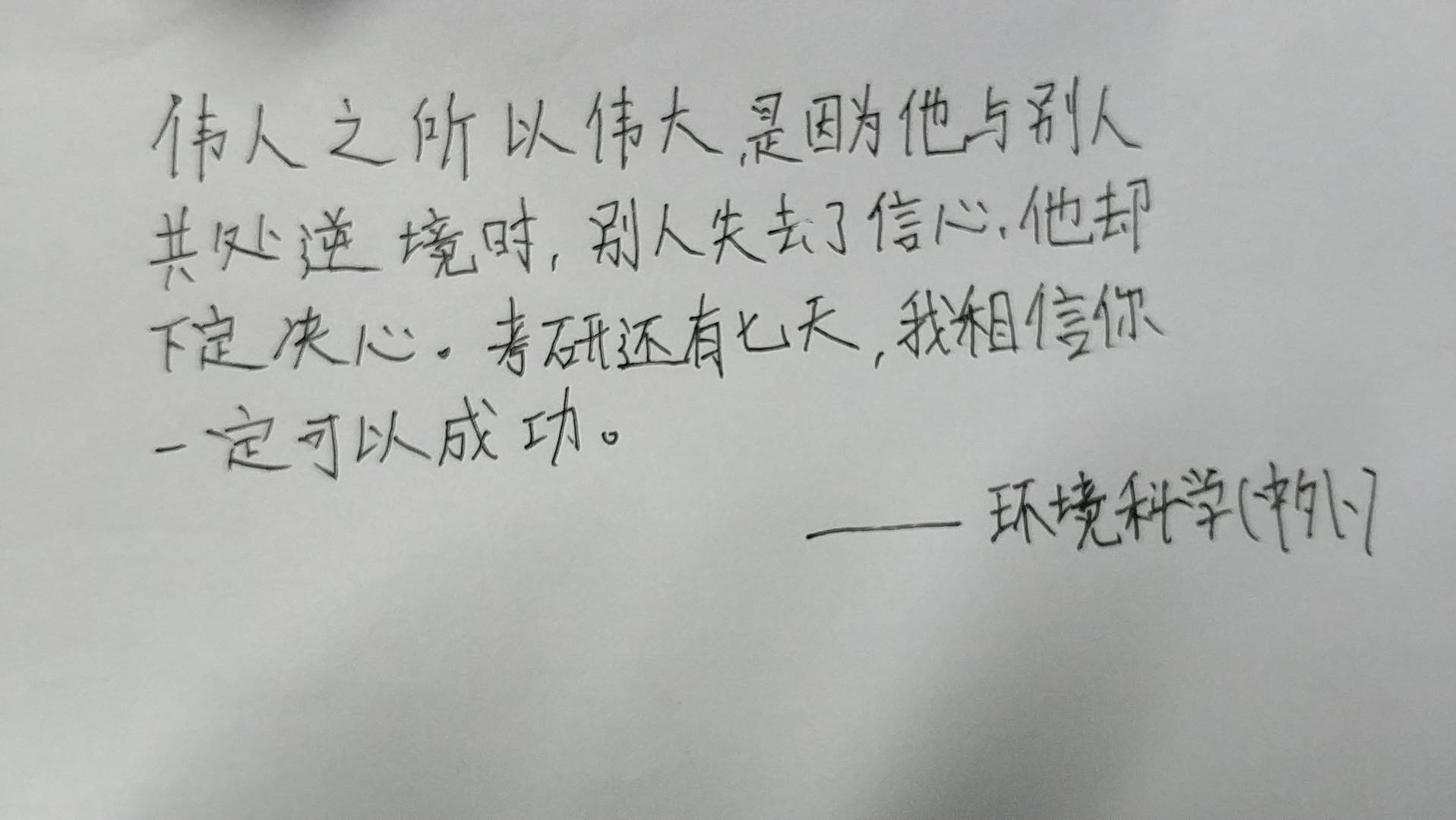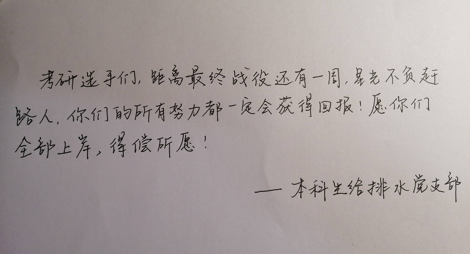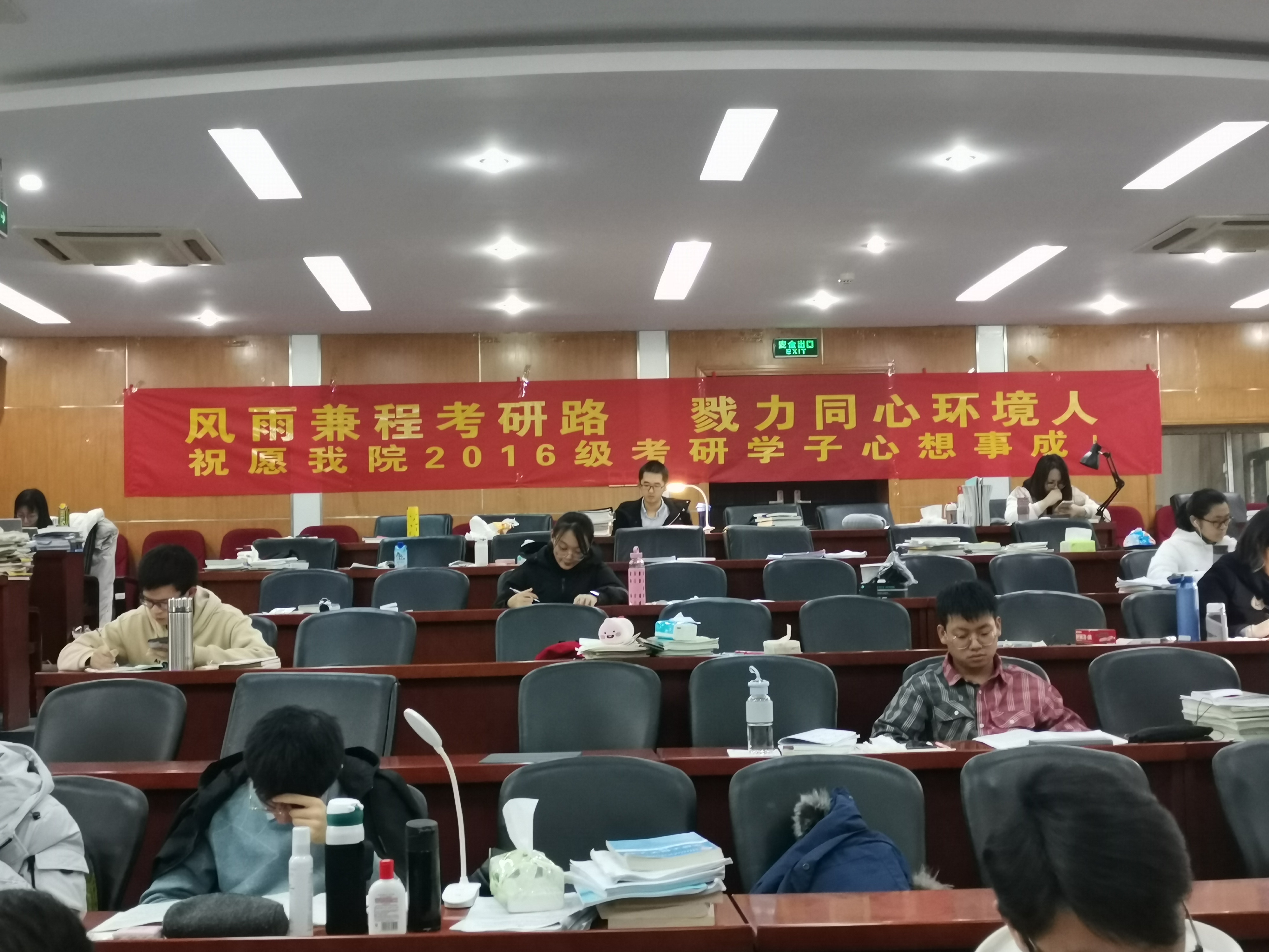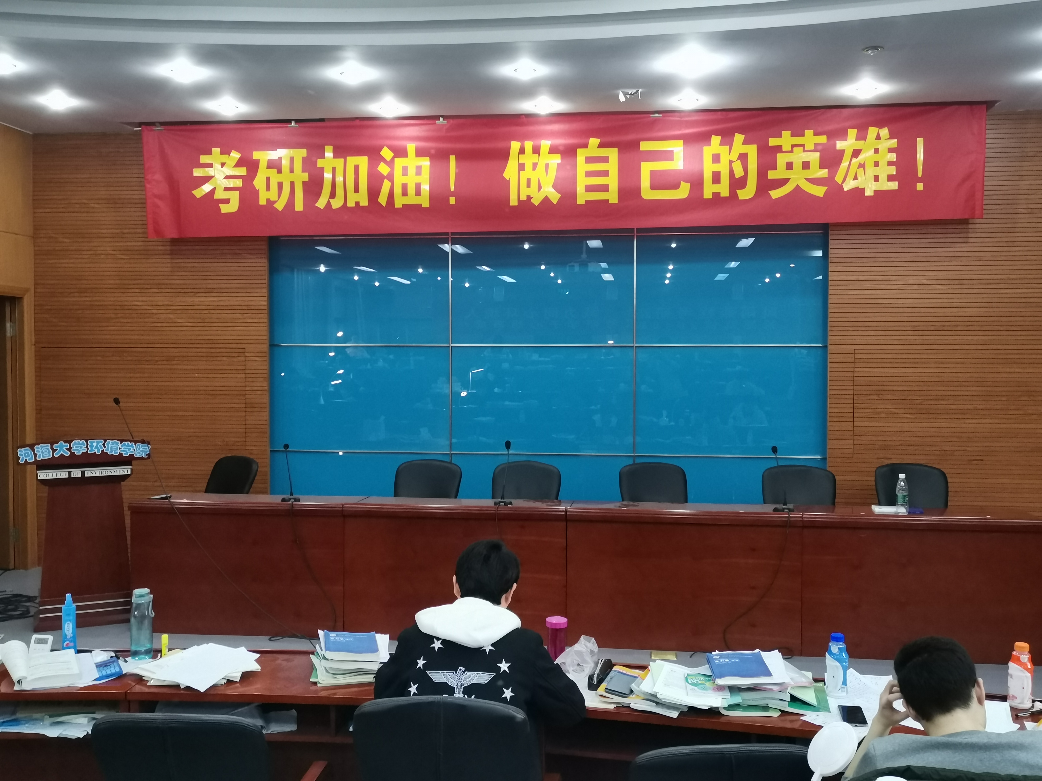 除此之外,为了让同学们能以更好的状态准备考研,环境学院给予了十足的关怀。在学习方面,学院特地向学校申请了水利馆301的会议室作为环境学院同学们的专用考研复习教室,给同学们提供了一个固定而温暖的学习空间,为同学的复习生活提供了极大的便利。在生活方面,学院在快要来临之际举办了考研动员大会,鼓舞考研同学的士气,缓解大家的紧张与压力,让同学尽量以最佳的心态复习应试,同时也为学生的复习计划提供了参考经验。学院还精心订制了条幅展示于考研复习教室的前后,让大家在学习之余能够感受到学院老师和同学们的鼓励,希望同学能够心想事成、不负青春、做自己的英雄!