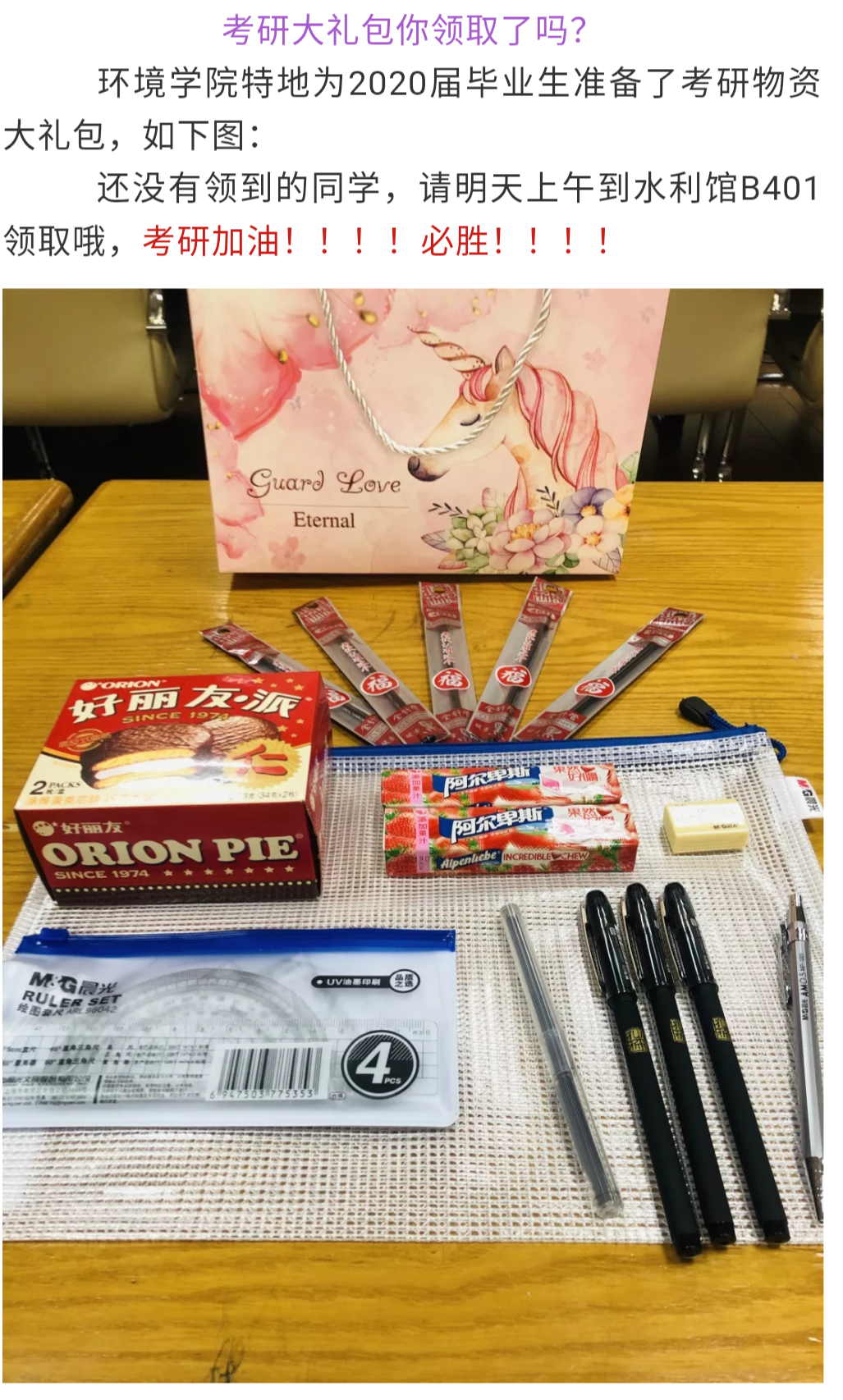 同学考研的紧张气氛渐浓,环境学院特地策划本次系列活动,辅导员金意倩老师和年级长牵头,年级及班级文艺委员协助组织实施的考研大礼包放送活动也顺利地开展,在活动现场,辅导员金意倩老师帮助同学们排忧解难、扫除心理障碍,同时给同学们加油打气:“考研并不是某种意义上的一个终点,而是一个起点,同学们在其中只需要享受这个过程就足够,结果顺其自然,青春也就无悔。”辅导员金意倩老师的一字一句都鼓舞着每一位环境学院考研学子,除此之外,为2020届毕业生准备了考研物资大礼包,其中包含了同学复习时会用到的铅笔橡皮、若干水笔、套尺、补充能量的零食,还准备了应试时需要带入考场的文件袋,从物质上给予了同学支持,让同学感受到了学院对考研同学的支持与鼓励。