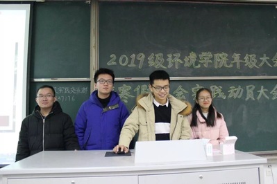环境学院团委实践部部长张旭同学向大家介绍了6个实践活动的内容:理论宣讲、农村饮用水状况调研、职业体验、社会调研、教育关爱和源泉工程,并向大家讲解了实验前的实践立报、实践过程的通讯稿与照片、实践总结的1500字个人总结与3000字团队总结等团队实践注意事项,使同学们了解到寒假社会实践活动的整个流程。2018级的沈佳艳、周郁、唐国涛同学向大家分享了他们认为在社会实践活动中可能会遇到的问题并提出解决建议。例如:在实践初期选题与组队时要明确整体规划、调查问卷设计与分发时的注意事项和成功经验介绍等等。