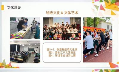 校艺术团团长郑天铭带领班级在告别江宁文艺晚会上积极展现才艺、环境院体育部部长周晓伟组织了环境专业拔河对抗赛,促进了班级文化体育全面发展。