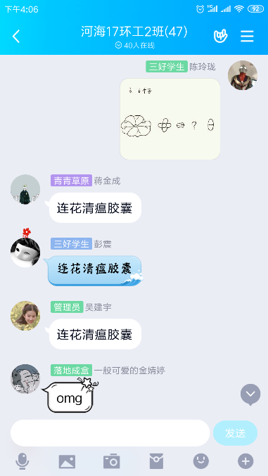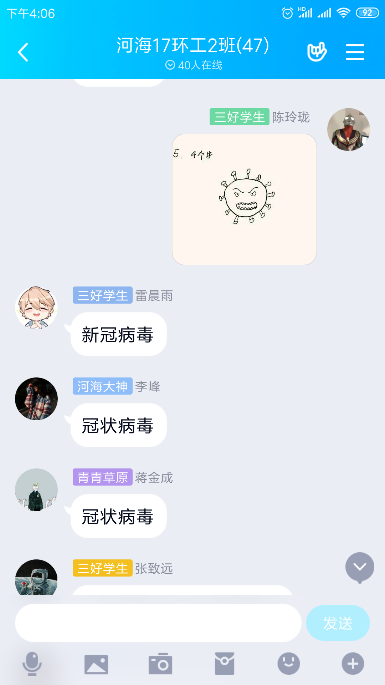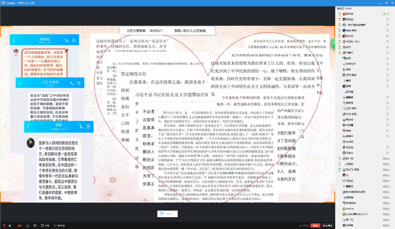 5月15日下午3时,由团支书陈玲珑主持线上班会。班会分为理论学习成果分享、主题宣讲、知识问答、战疫宣传四个部分。