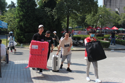 下午1:00,环境学院团委书记、2020级辅导员金意倩老师,2020级辅导员杨铮老师,2019级辅导员扈雅璐老师、程萌老师以及迎新志愿者们提前来到相应服务点准备迎接新生。从江宁校区南门到宿舍,新生全程都有由环境院安排的志愿者陪伴。志愿者热情地帮助新生运输行李并且细致地引导他们住宿报到。