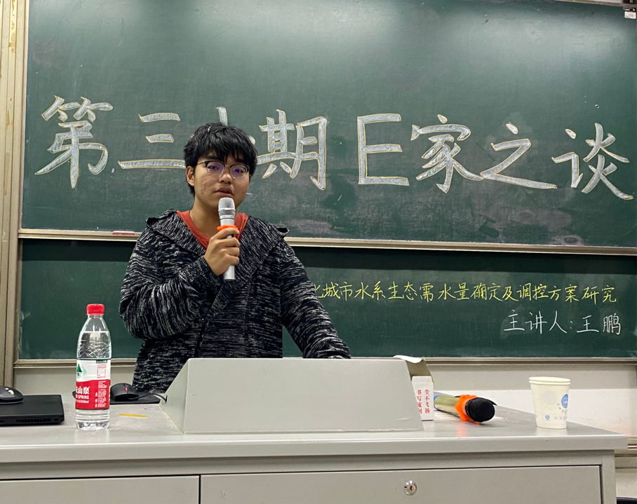 10月31日晚,环境院院科协在致用楼101举办了第三十期E家之谈。本期邀请到硕士生导师王鹏老师为同学们讲述了高度人工化城市水系生态需水量确定及调控方案研究,使参会同学受益匪浅。