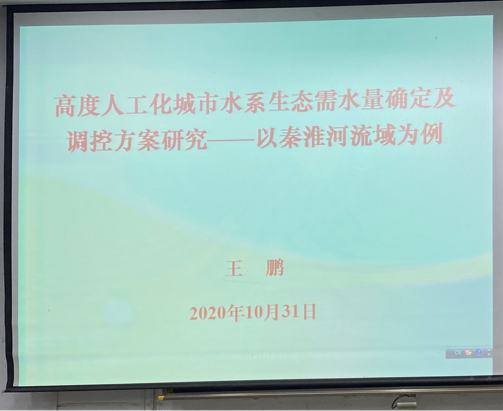 对于秦淮河流域骨干河道生态基流的研究,王鹏老师明了的指出河流根本生态需水目标:保持河流形态与结构稳定性、维持水生生境与生物群落多样、保护区域稀有物种、维持水沙物质输送、调节区域气候与水分、净化水质、提供经济社会用水和维持河流景观。深入剖析了人工化河流的特点,王鹏老师用清晰的图表、数据和专业的知识架构、公式让同学们快速认识到了秦淮河干流段生态基流,细致耐心的讲解使在座的同学们茅塞顿开。