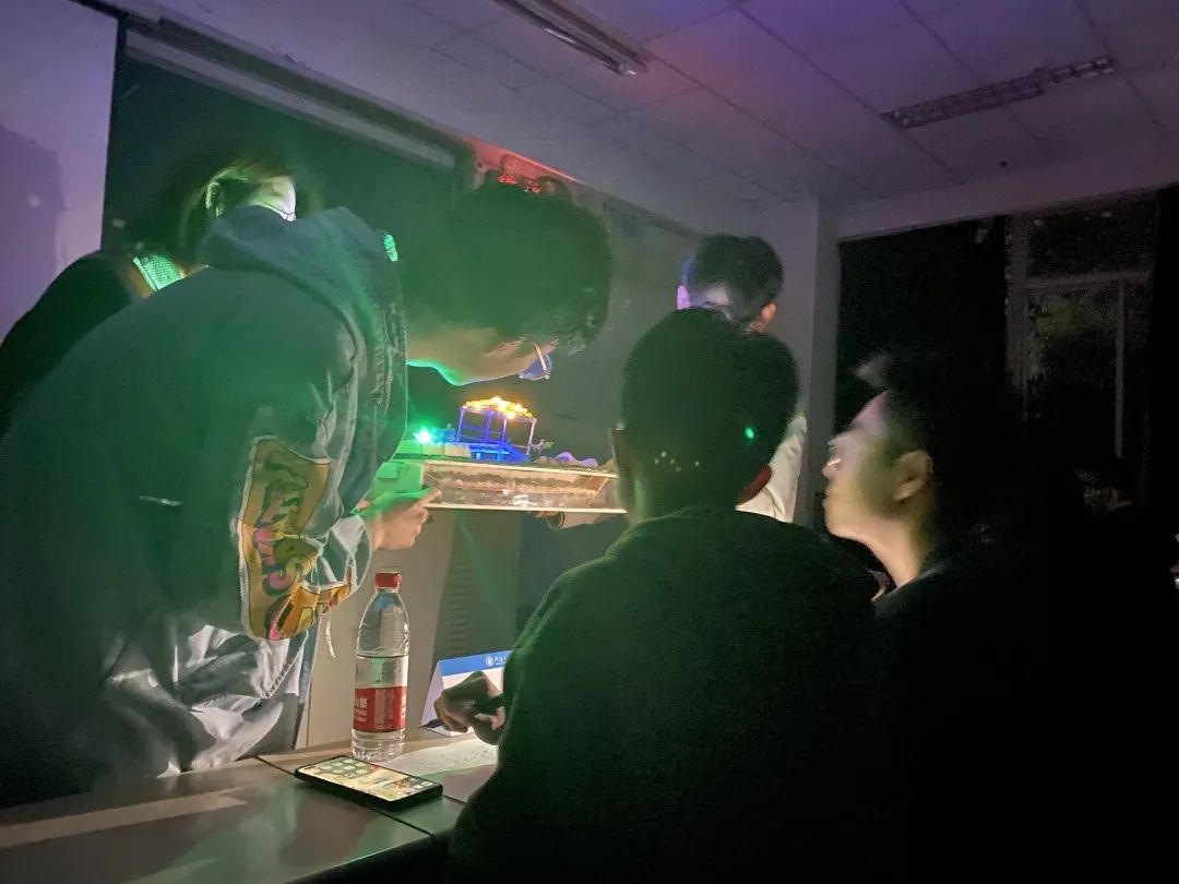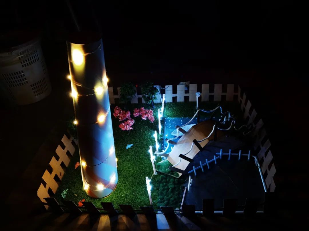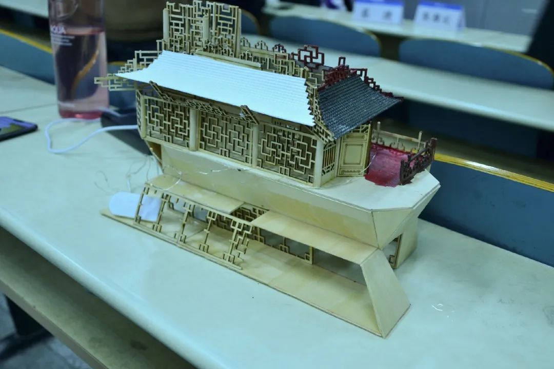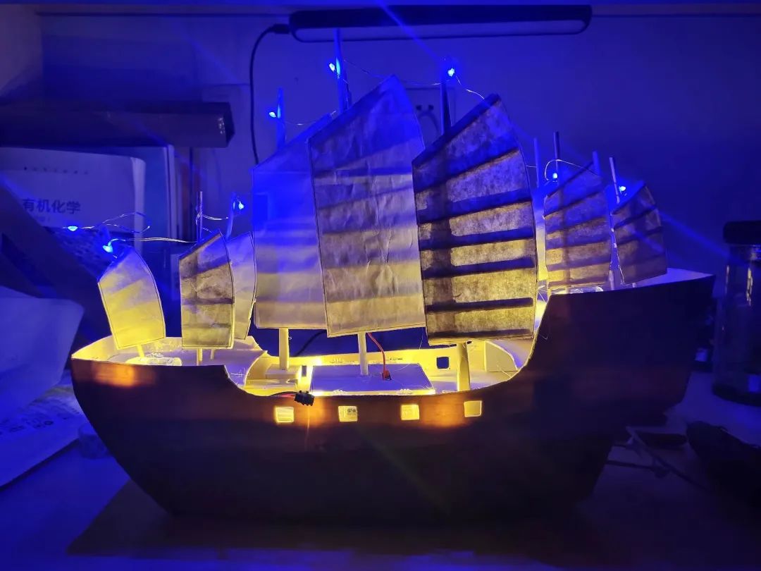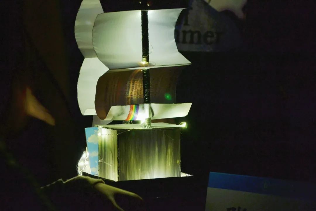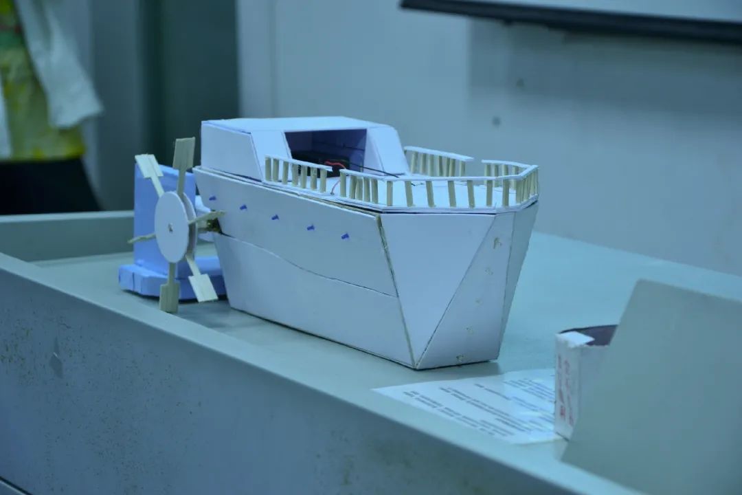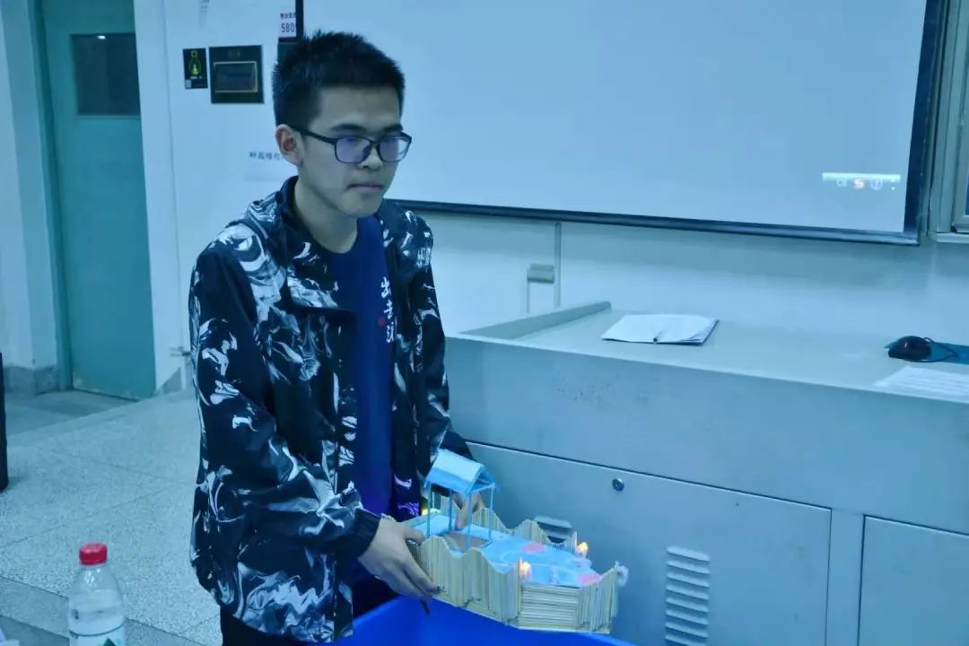 为了契合桨声灯影的主题,选手们别出心裁的灯光设计让人眼前一亮。LED灯的插入十分巧妙——独具匠心的选手将小灯泡插入灯笼里,营造出“江船火独明”的诗意氛围。水面上荡漾开的光影交织在船体上,引人遐想。秉持着环保理念,选手们大多使用了PVC板和木材类的环保材料进行制作,上色和粘合也使用的丙烯颜料与热熔胶,最大程度减少了材料对环境的影响。同学们在保证船体稳定性的前提下,尽可能地使用生活中废弃的木筷和快递盒,使其绽放了第二次生命。