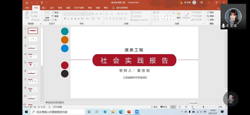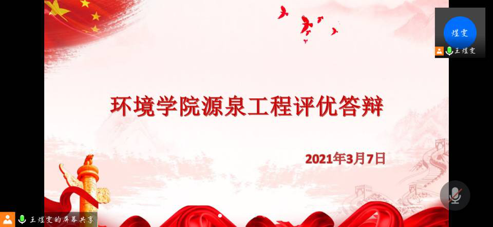2021年3月7日下午,河海大学环境学院举办了“源泉工程”线上评优答辩。本次答辩由2020级给排水科学与工程2班王煜雯担当主持人,院团委书记金意倩老师、2020级辅导员杨铮老师、院团委副书记唐柏杨、往届寒假实践优秀获得者吴建宇以及唐国涛担任评委。