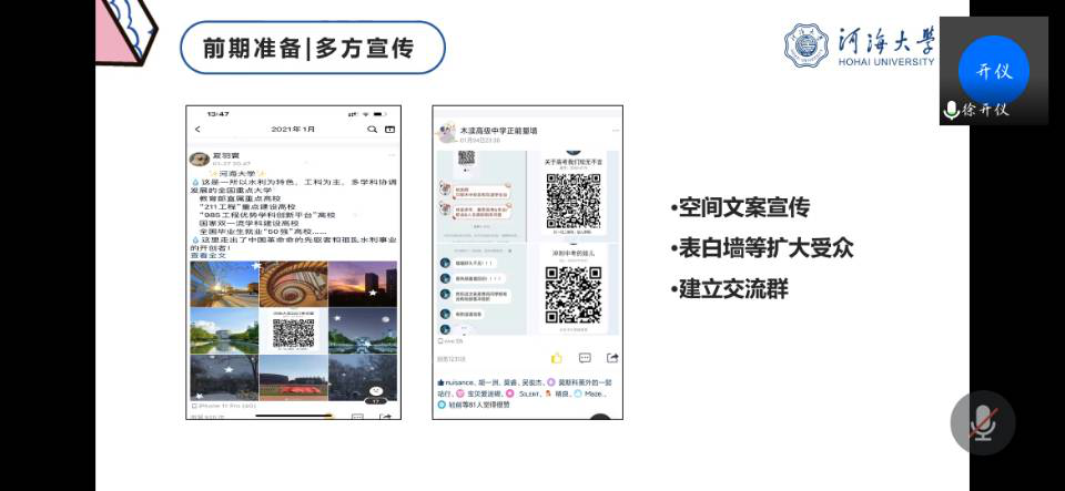第一组在宣讲前进行了广泛宣传,撰写策划书并联系高中负责人,充分调动学生家长参加宣讲会,在线上线下共开展了7次宣讲,广泛宣传了河海大学,提高了河海大学的知名度。在宣讲活动结束之后,他们还做了回访调查,确定了活动成果和收获,并在QQ群中为学弟学妹们答疑解惑。