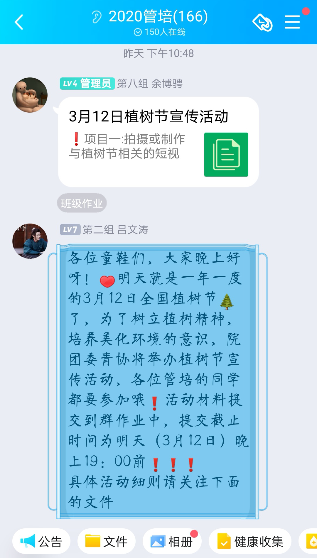 活动开展前期,青协干事在环境院管培群中积极呼吁同学们参加这次植树节宣传活动,随后由相关负责人告知活动规则并统计志愿者名单。