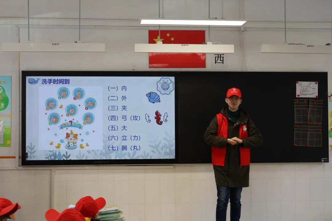 升旗仪式结束,志愿者们分为两组,到两个班级中开展用水思源、节水源远的主题班会。