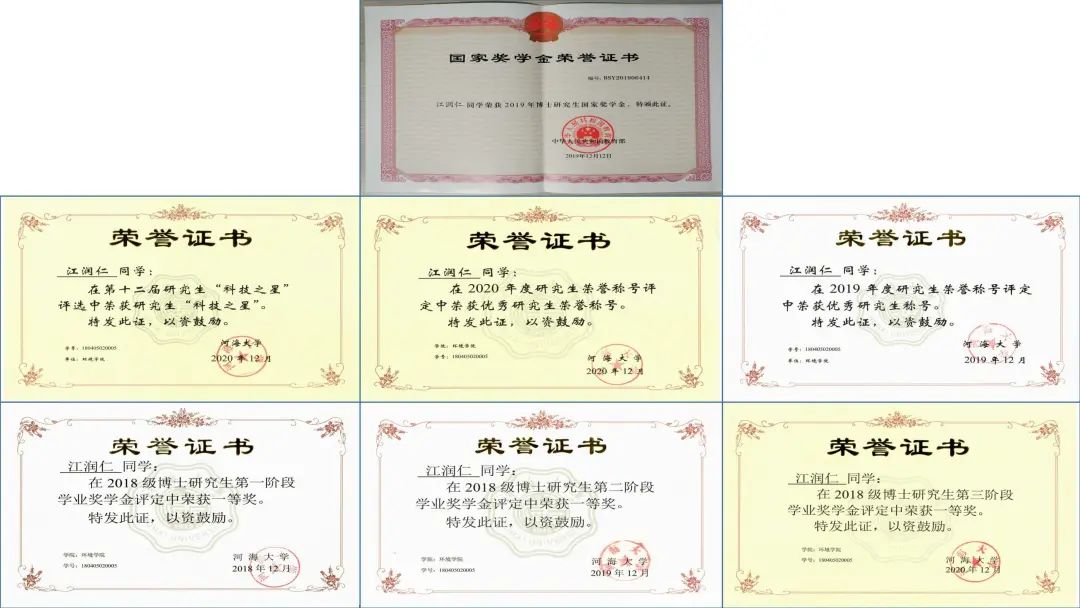 他用笃学筑为学之本,在实践中明知行合一。读博期间以第一作者身份发表A类期刊SCI论文8篇,总影响因子达59.327,其中3篇论文入选“ESI高被引论文”,1篇论文入选“ESI热点论文”。申请国家发明专利9项,其中已授权国家发明专利3项。他学业优秀,连续三年获得河海大学一等学业奖学金,2019年博士研究生国家奖学金。荣获河海大学“2020年度优秀研究生”;河海大学第十二届研究生“科技之星”;河海大学“2019年度优秀研究生”等荣誉称号。他勇于承担,求真务实,博士期间主持了江苏省研究生科研与实践创新计划项目、河海大学优秀博士生培育计划、河海大学环境学院优秀博士培育计划。