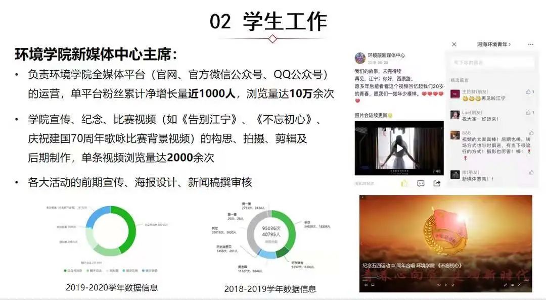 敏而善思,成绩优异,曾荣获国家奖学金、河海大学学业优秀奖学金、社会工作奖学金、精神文明奖学金、科技创新奖学金等多项奖学金;江苏省优秀学生干部、河海大学优秀学生标兵、优秀学生干部、优秀共青团干部、大学生优秀记者等多项荣誉称号;曾赴加拿英属哥伦比亚大学交流学习。她积极参加科研活动,曾获第十三届节能减排社会实践与科技竞赛三等奖,第六届 “互联网+”大学生创新创业大赛校内选拔赛铜奖等。她热衷社会实践及志愿服务,主持1项校级重点社会实践项目,多次担任大型活动志愿者,积极参与献血活动等。她积极投身学生工作,现任环境二班组织委员,曾任环境学院新媒体中心主席、年级心理委员、环境二班团支书、第十期“青马工程”学员等。