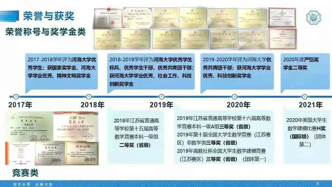 目标明确,严于律己,绩点4.85,排名专业第一。曾获严恺奖学金、国家奖学金等9项奖学金;河海大学优秀学生标兵、优秀共青团干部等5项荣誉称号。她积极参加科研活动,以第二作者发表一区SCI论文1篇(导师一作),第四作者发表1区SCI论文1篇,负责国家级大学生创新训练项目一项并以优秀结题。在学科竞赛上,她积极参加大学生数学竞赛和数学建模竞赛,数理知识扎实,曾获江苏省普通高等学校第十五届高等数学竞赛本科一级组二等奖,2019年高教社杯全国大学生数学建模竞赛本科组江苏赛区三等奖等5项奖项。曾任环境学院青年志愿者协会部长,现任2017级生态一班团支书。