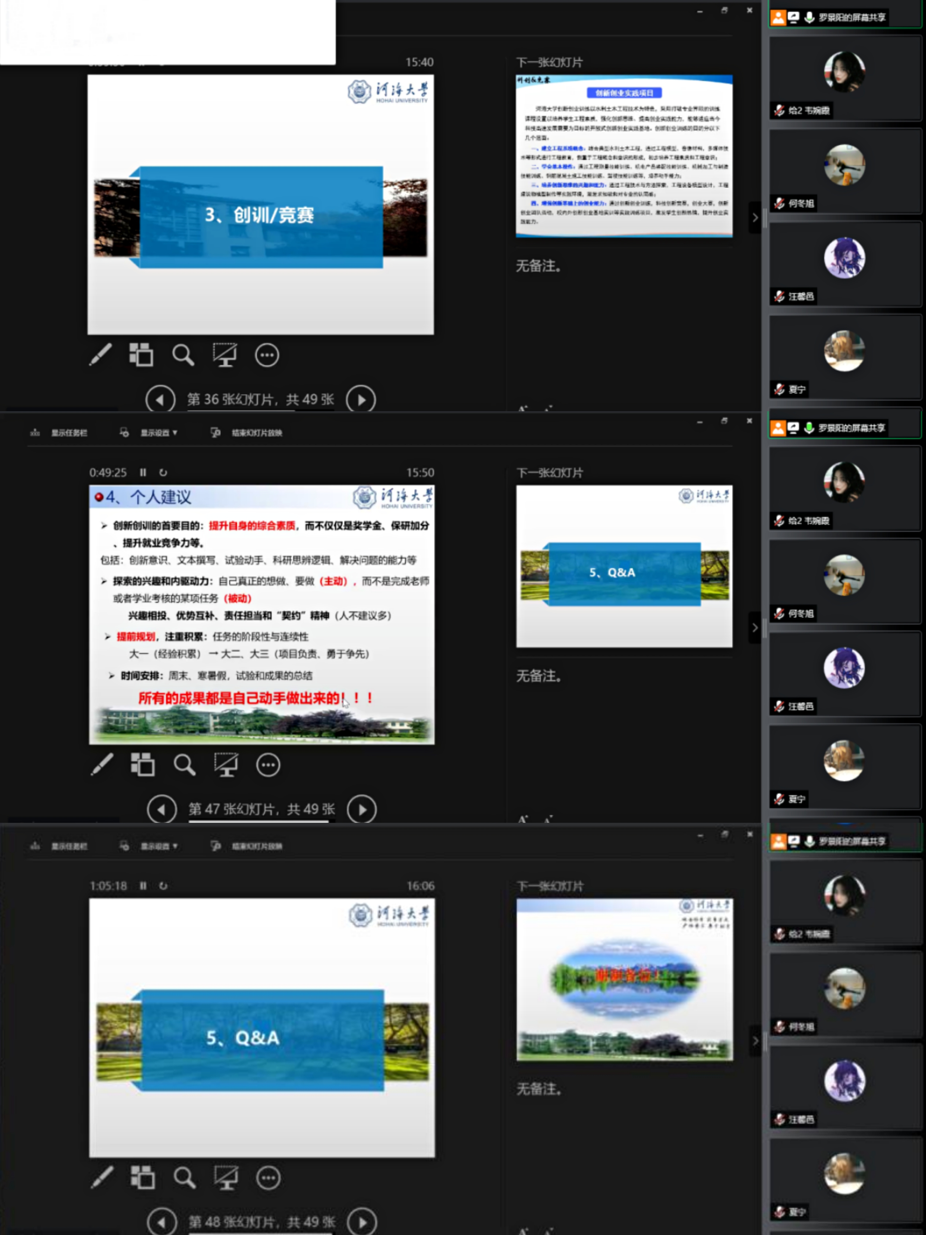 罗景阳老师提到“所有的成果都是自己做出来的!”,并向给排水专业的同学提出几点建议。首先,要不断提升自身综合素质,包括创新意识、文本撰写、解决问题的能力等。其次,探索兴趣和内驱动力,同学们需要寻找自己感兴趣的领域,并学会与团队优势互补、相互合作。最后,提前规划与注重积累,任务是具有阶段性与连续性的,时间的统筹尤为重要。