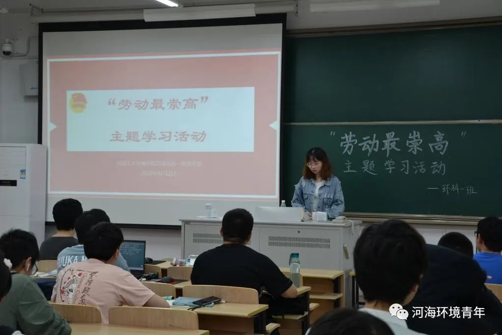 习近平总书记在全国劳动模范和先进工作者表彰大会发表重要讲话。习近平总书记强调,光荣属于劳动者,幸福属于劳动者。为深入贯彻落实习近平总书记的重要指示,帮助同学们更好地理解讲话精神,2022年5月12日晚21级给排水一班,环科一班在博学楼b420举行了“劳动最崇高”主题学习活动。本次劳动教育活动分为三个阶段进行,班级学习委员苏赫洋、楚嘉欣同学担任主持人。