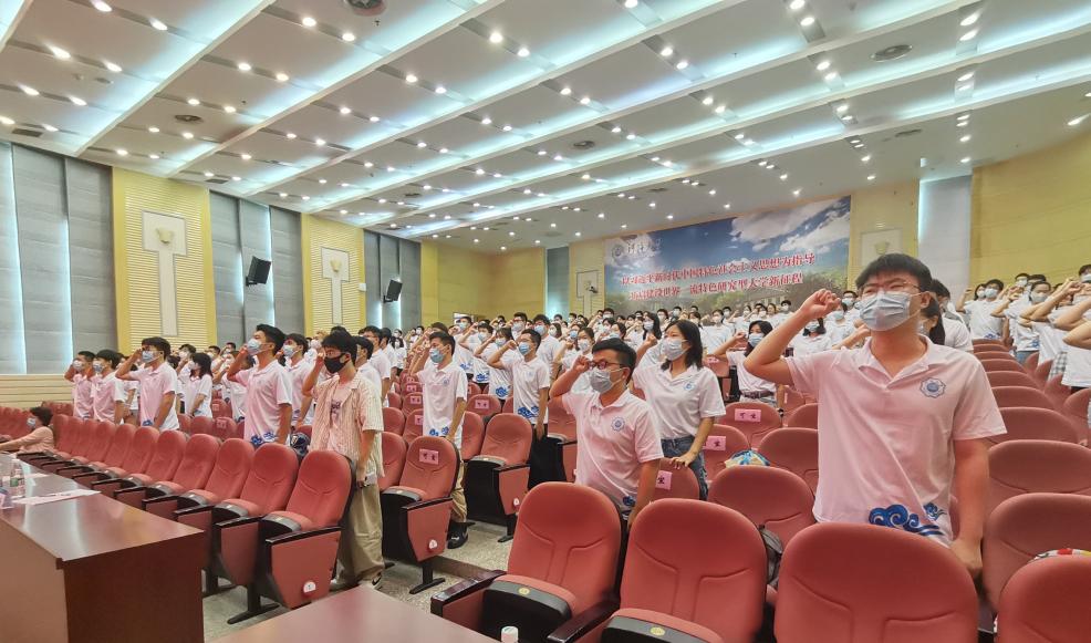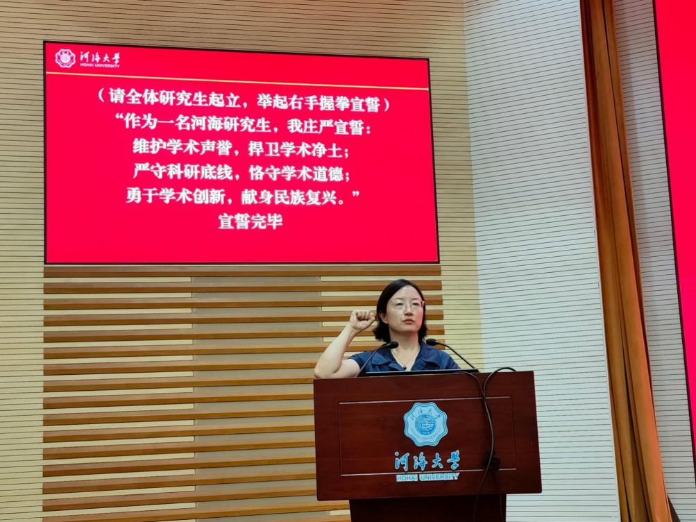 戴玉珍副书记带领全体新生进行学术诚信宣誓。通过宣誓,戴书记希望同学们能够铭记作为一名河海大学环境学院的研究生的责任与担当。勇立潮头,敢为人先,为中华民族伟大复兴事业奉献终生!因为有你,环境更美。
