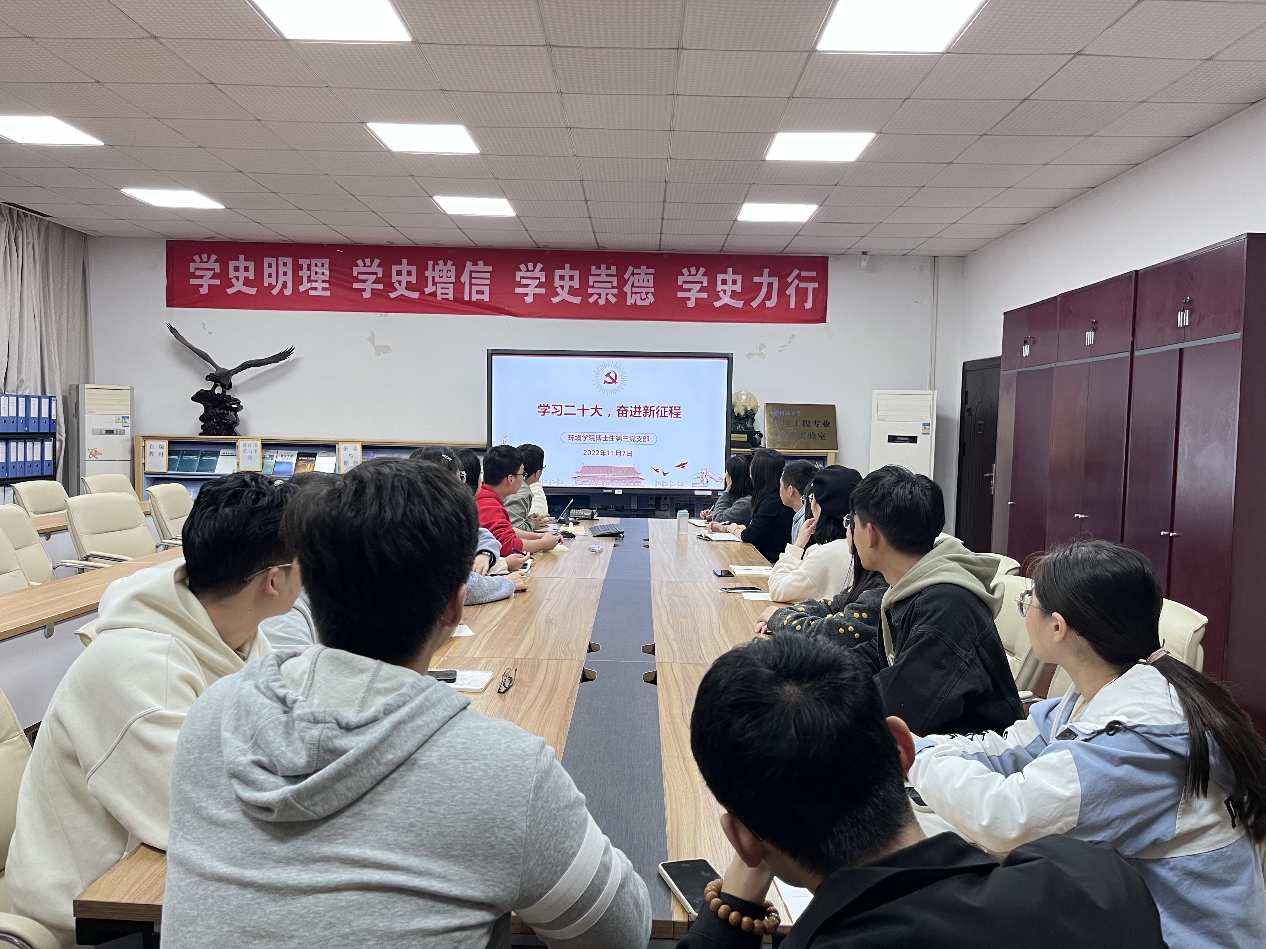 会上,支部成员就党的二十大报告第十部分“推动绿色发展,促进人与自然和谐共生”展开专题讨论。支部成员纷纷表示,环境是人类生存的基本条件,是人类赖以生存的基础。作为环境专业青年博士生党员群体,要以舍我其谁的奋斗姿态,将推进美丽中国建设当作无上光荣的职业责任,把实行节能低碳融入日常生活体系,为实现生态优先、节约集约、绿色低碳发展贡献青春力量。