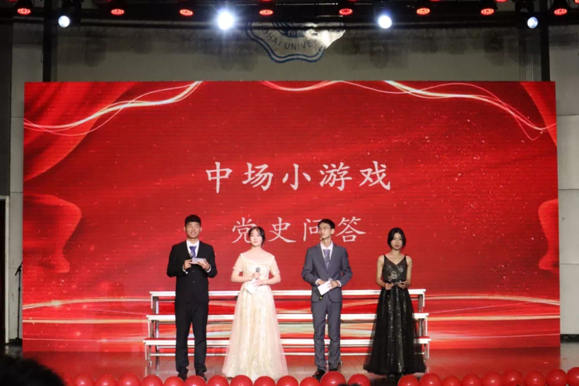 在中场休息时,主持人与观众们开展了有趣的党史问答游戏。同学们积极参与,踊跃发言,学到了二十大和党章修改的相关内容,更深刻地了解了中国共产党的百年发展历程。
