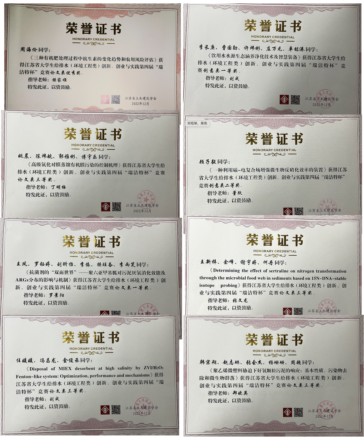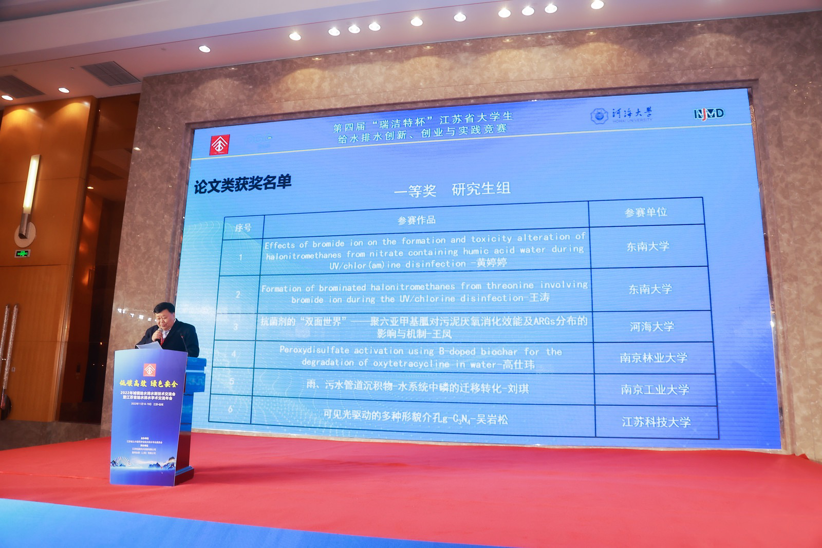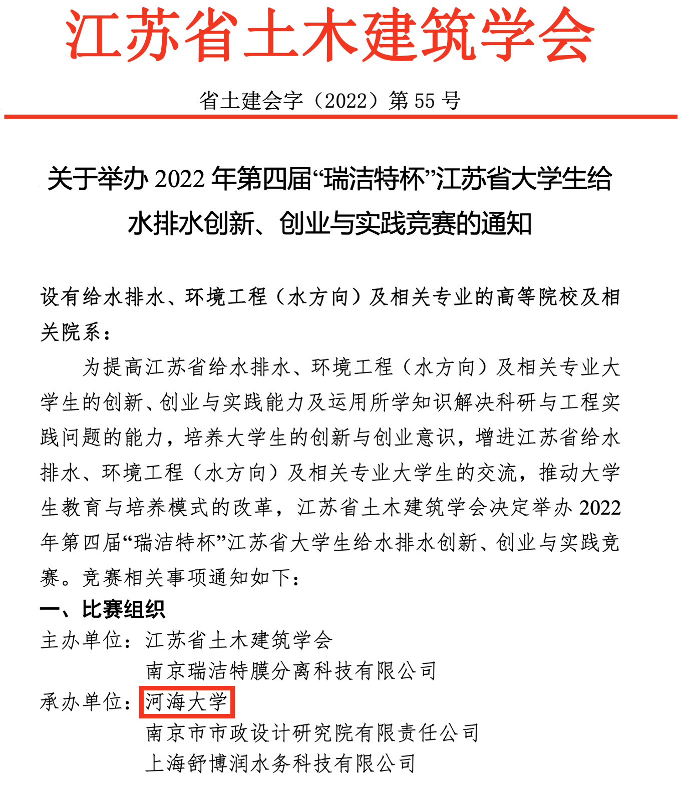 2022年11月18日,由我校承办的第四届“瑞洁特杯”江苏省大学生给水排水创新、创业与实践竞赛颁奖典礼暨闭幕式在江苏盐城举行。本次大赛由江苏省土木建筑学会、南京瑞洁特膜分离科技有限公司主办,河海大学环境学院为主要承办单位。本届竞赛共收到全省20所院校共计134项作品。