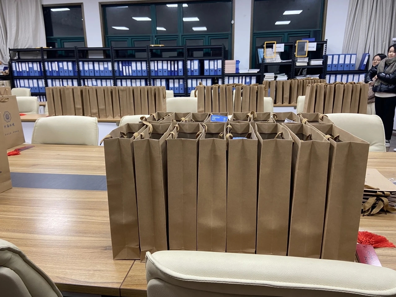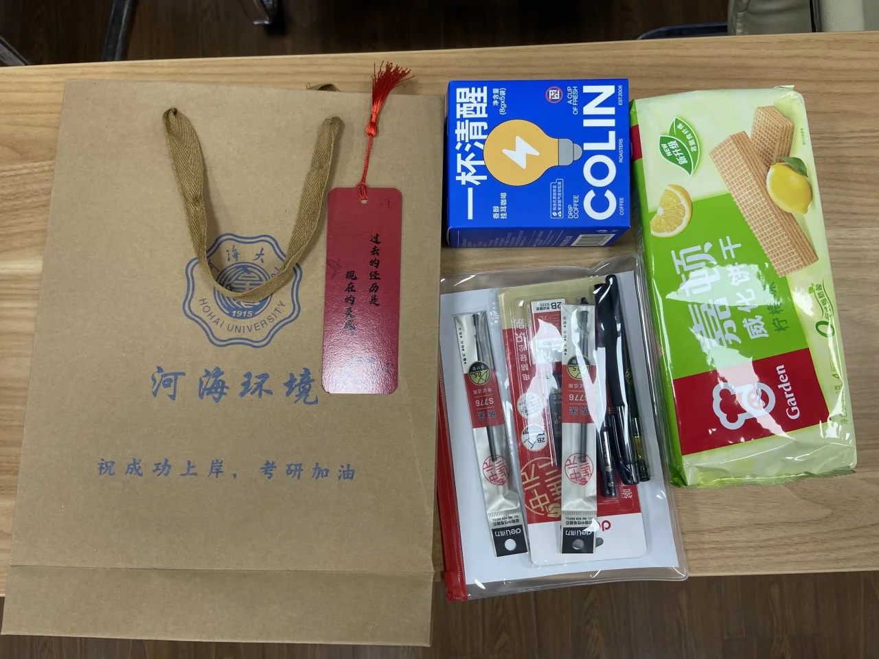 满满当当的礼包寄托着环境学院对考研学子的真切关怀,每一个实用而精美的礼品都将为他们的最后冲刺注入动力。威化饼干能够为考研学子补充能量,香醇的咖啡有助于提神醒脑,齐全的文具套装则寓意着“以笔为剑,披荆斩棘”,祝福卡片上振奋人心的文字饱含着同学们美好的祝愿。