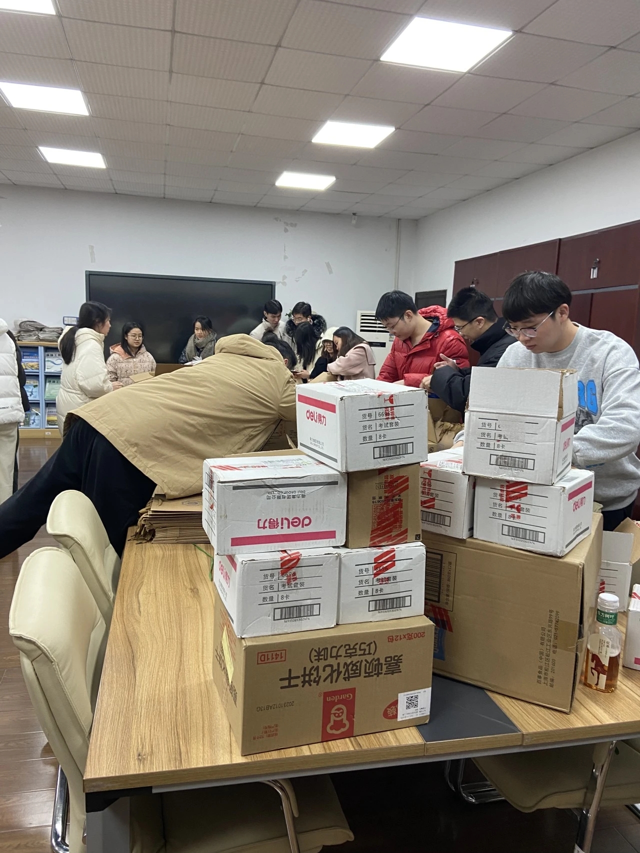 老师和同学们早早地来到办公室,分装、打包、挂祝福贺卡……悄悄为考研学子准备这份冬日惊喜。