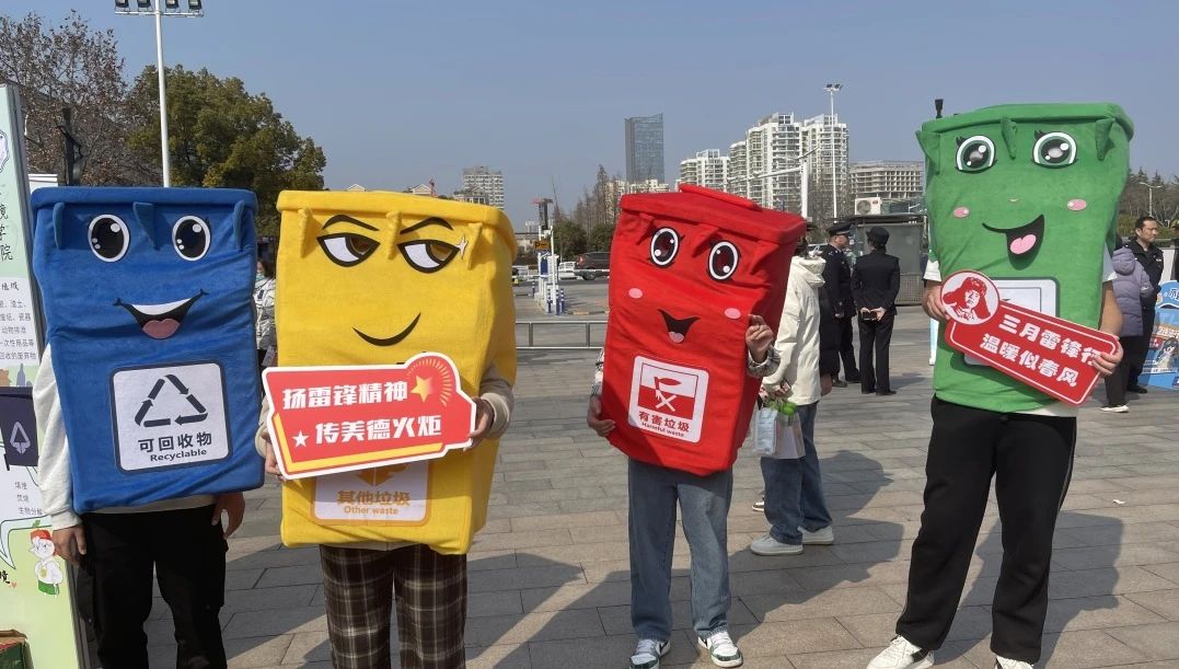 志愿者扮演的不同类型垃圾桶的人偶形象,引导社区居民参与垃圾分类互动游戏和有奖问答,使垃圾分类知识深入人心,憨态可掬的人偶形象也吸引了许多路人驻足合影。