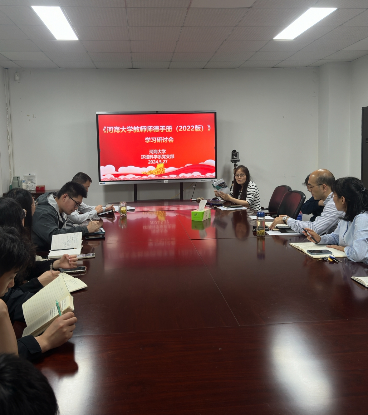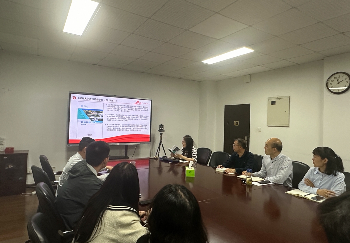 活动中支部书记顾莉同志介绍了教育部、江苏省关于师德师风建设的相关规定,带领支部全体教师成员学习了《河海大学师德手册(2022版)》,重点讲解了其中有关教师队伍建设、师德师风建设、研究生导师行为规范、学术道德、教学规范等方面的内容。会议强调大力弘扬教育家精神,必须深刻理解习近平总书记关于师德师风第一标准的重要论述,牢牢把握新时代教师队伍发展中带有根本性、方向性、全局性的重大理论和实践问题,进一步加强师德师风建设,将师德师风第一标准贯穿为党育人、为国育才的全过程。