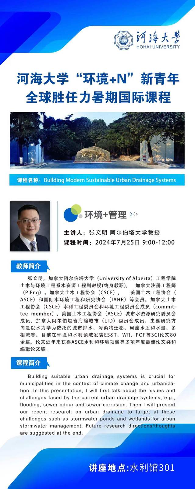 河海大学“环境+N”新青年全球胜任力暑期国际课程:“环境+管理”--现代城市排水系统建设与管理