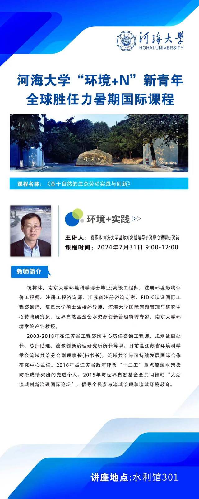 河海大学“环境+N”新青年全球胜任力暑期国际课程:“环境+实践”--基于自然的生态劳动实践与创新