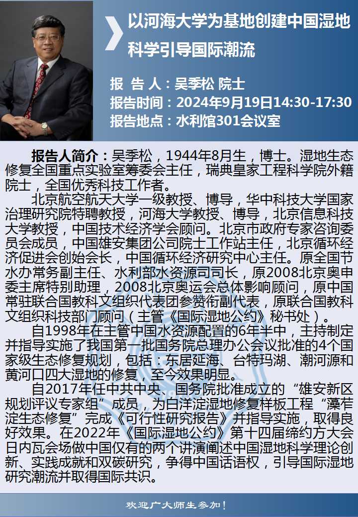 两山讲堂学术报告:以河海大学为基地创建中国湿地科学引导国际潮流